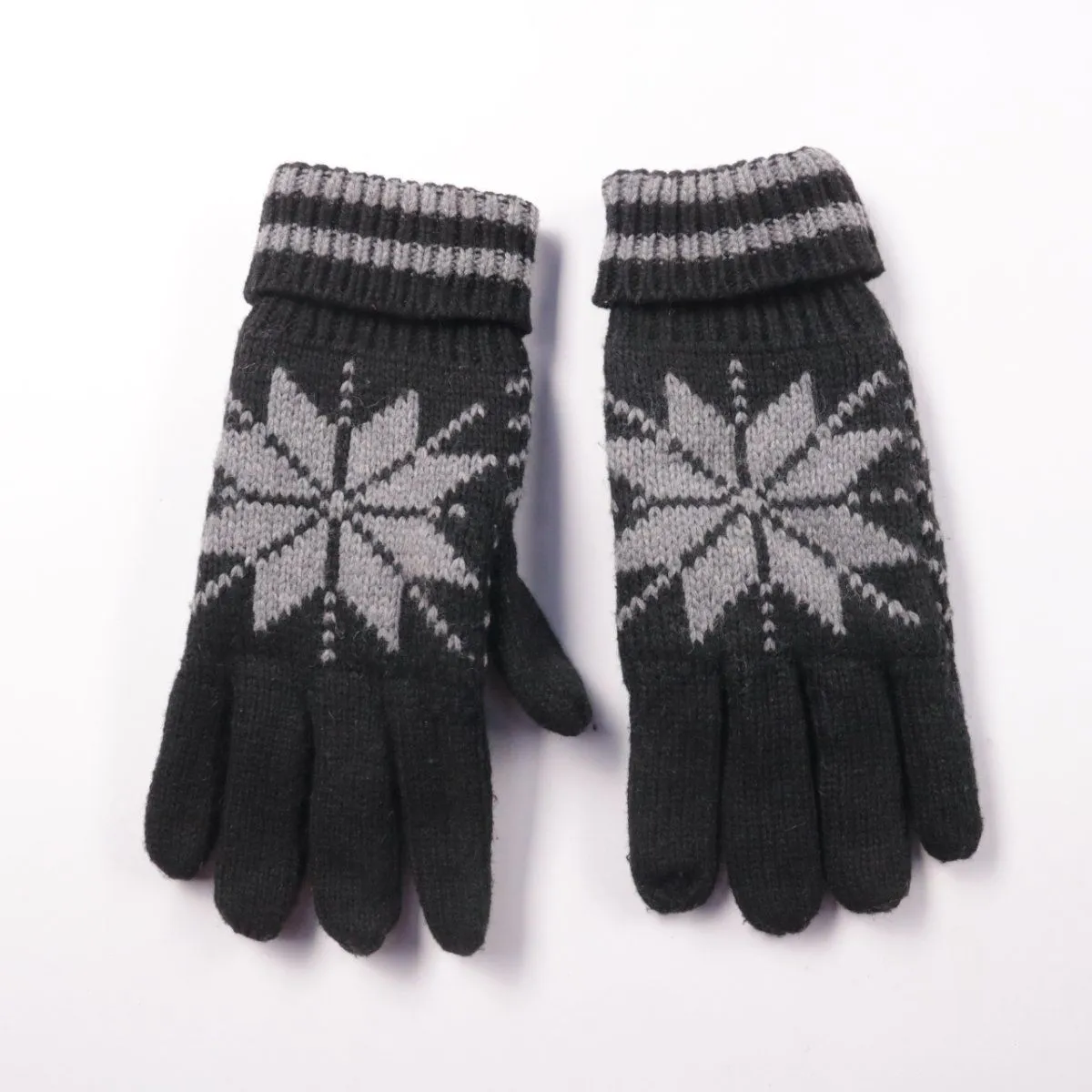 Вязаные зимние перчатки с узором «снежинка» в серо-чёрной гамме. Подойдут для прогулок и поездок в холодную погоду, хорошо сочетаются с повседневной верхней одеждой. Манжеты в рубчик плотно сидят на запястье и помогают удерживать тепло.