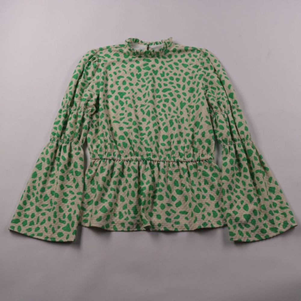 Блузка River Island для девочки с зелёным принтом на светлой основе и рукавами-клёш. Подойдёт для школы и прогулок в прохладную погоду, хорошо сочетается с джинсами и юбкой. Лёгкая ткань почти не мнётся и удобна в носке.