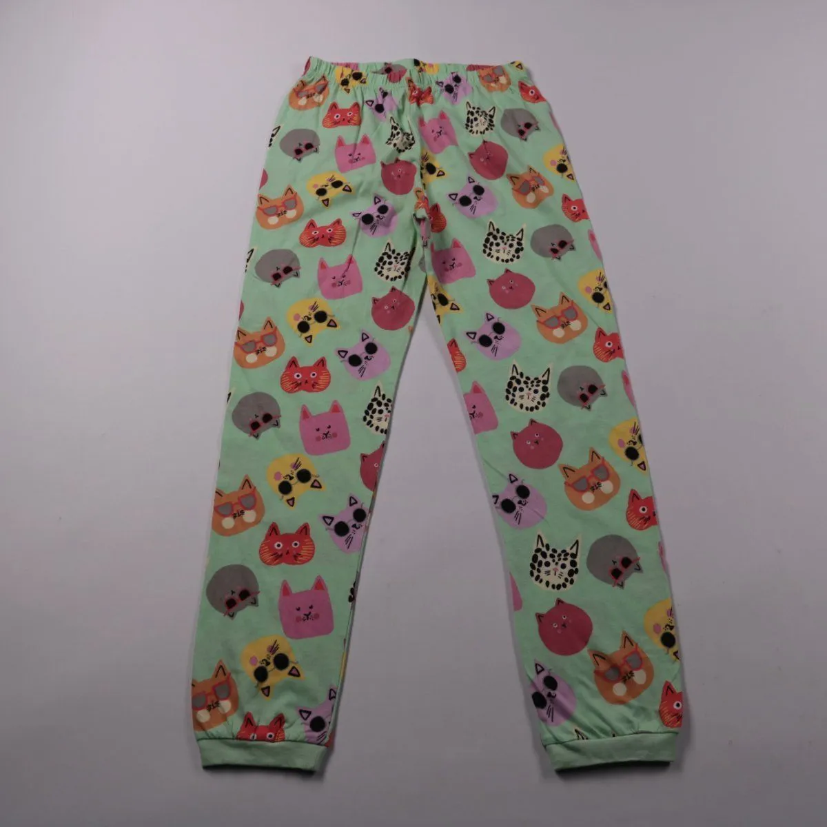 Легинсы Tu из хлопка, мятного цвета с ярким принтом мордочек котиков. Подойдут для дома, сна или повседневной носки в детский сад/школу. Мягкая резинка на талии и манжеты по низу помогают штанинам не задираться.