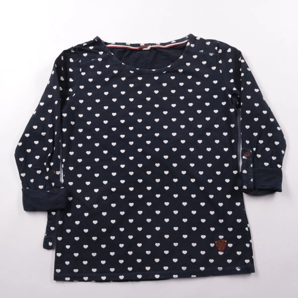 Лонгслив Ziki тёмно-синего цвета с принтом в мелкие белые сердечки. Подойдёт для повседневной носки в садик/школу и на прогулки, легко сочетается с джинсами и юбками. Натуральный хлопок приятен к телу и хорошо дышит.
