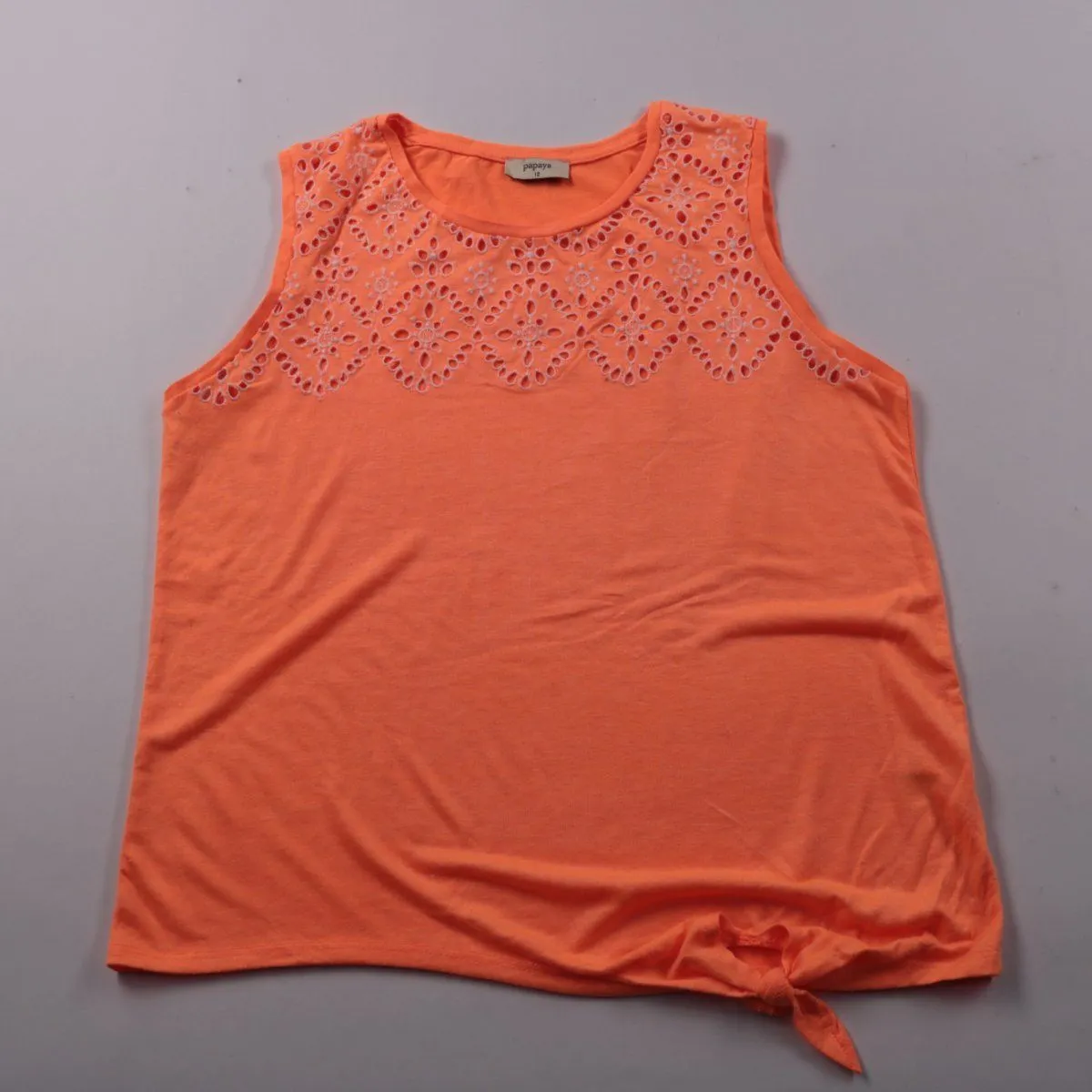 Детский топ Papaya оранжевого цвета без рукавов, с ажурной вышивкой по линии груди и завязкой снизу сбоку. Подойдёт для тёплой погоды и повседневной носки. Лёгкая ткань быстро сохнет и удобна в уходе.