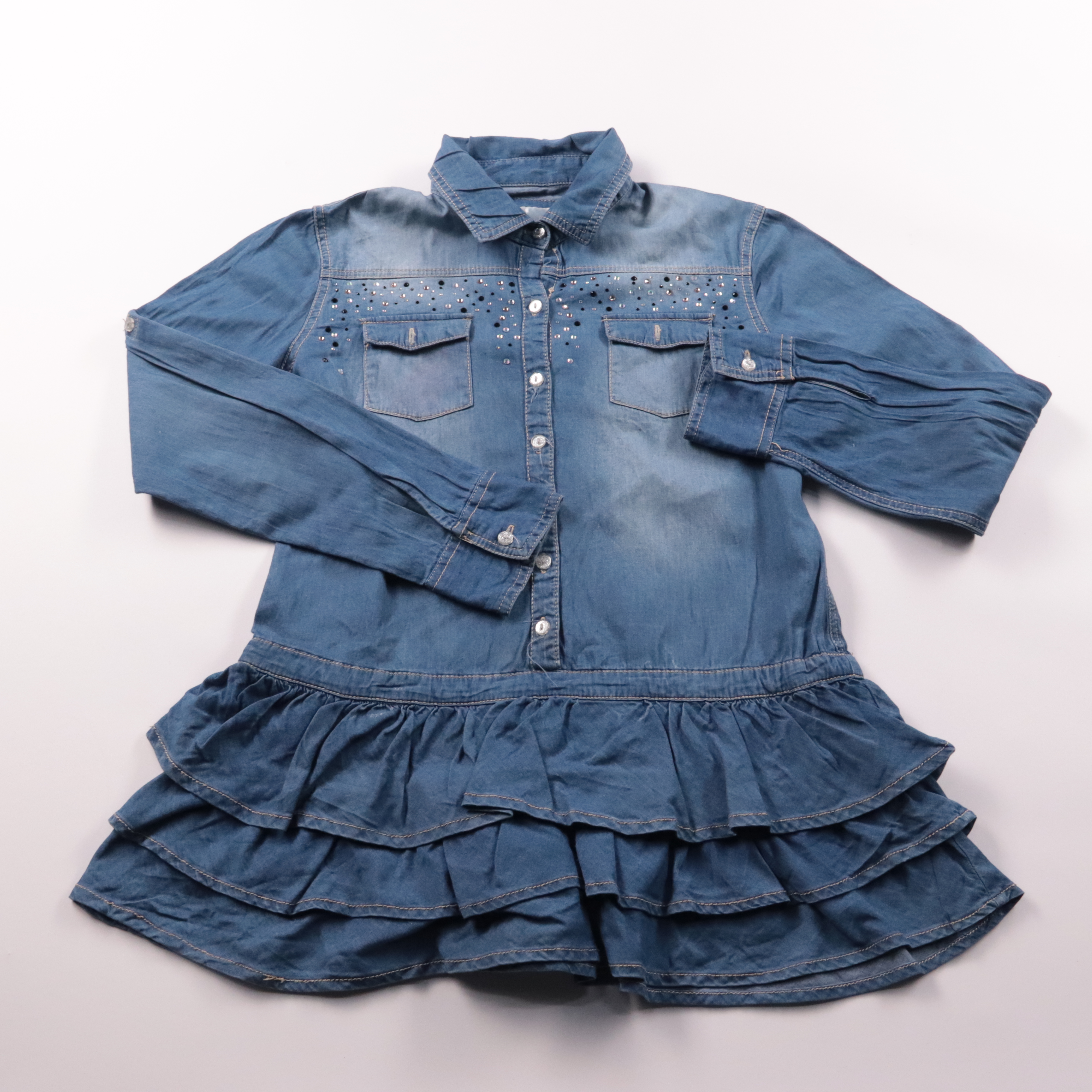 Джинсовое платье Justice с длинным рукавом, отложным воротником и застёжкой на пуговицы. Спереди два кармана и декоративные стразы, а низ выполнен с ярусными оборками. Подойдёт для школы и прогулок в прохладную погоду; плотный хлопок хорошо держит форм...