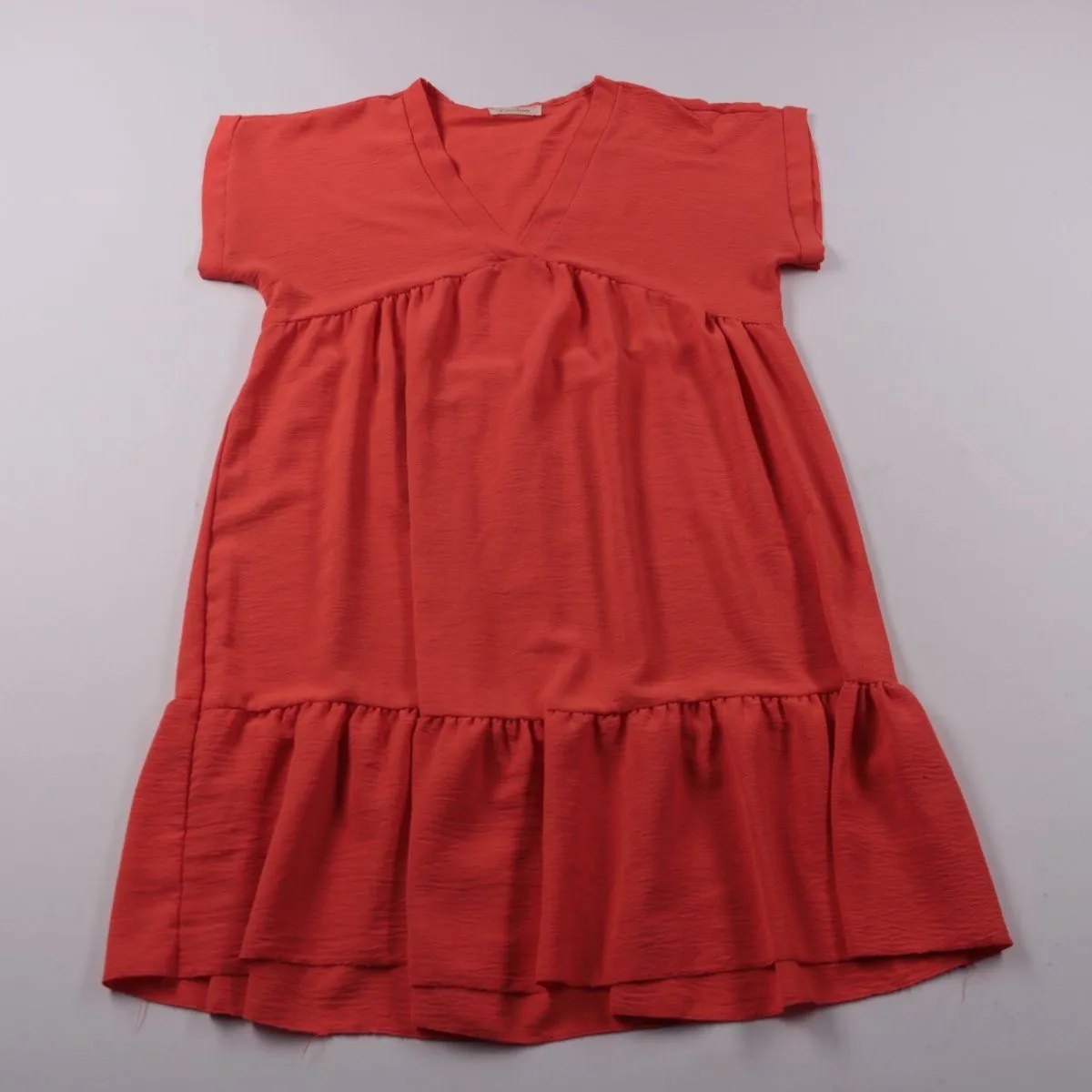 Летнее платье Passion красного цвета с V-образным вырезом, короткими рукавами и ярусной оборкой по низу. Подойдёт для прогулок и повседневной носки в тёплую погоду. Лёгкая ткань на основе вискозы хорошо дышит и быстро сохнет.