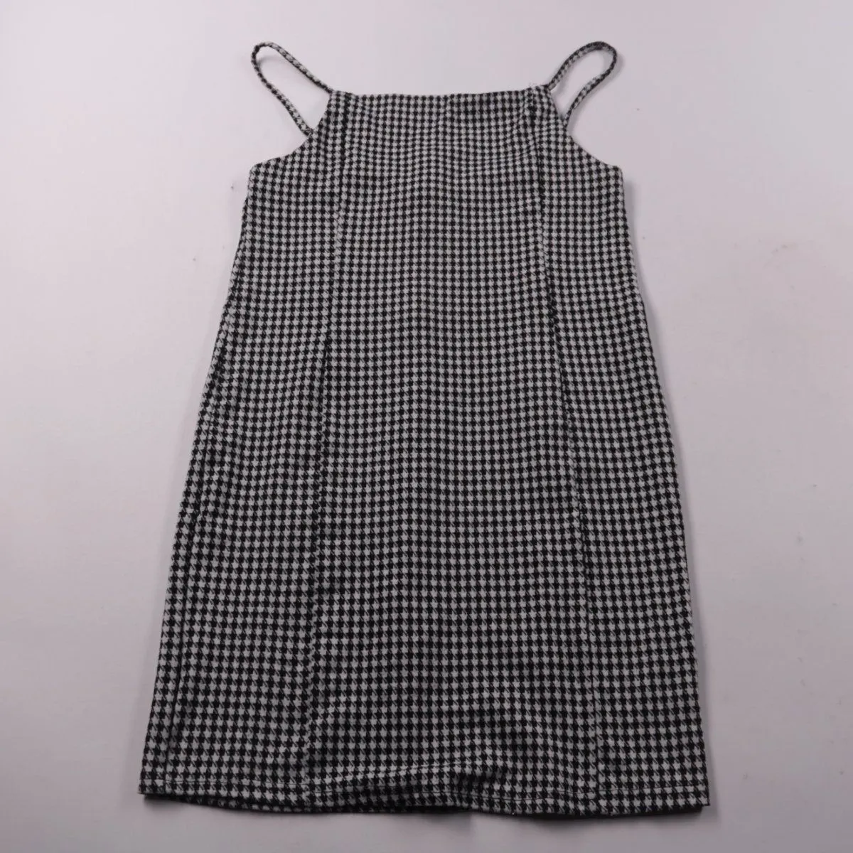 Платье Primark на тонких бретелях с чёрно-белым принтом «гусиная лапка». Подойдёт для летних прогулок и повседневной носки, можно сочетать с футболкой или кардиганом. Лёгкая ткань и простой крой удобны в уходе и носке.