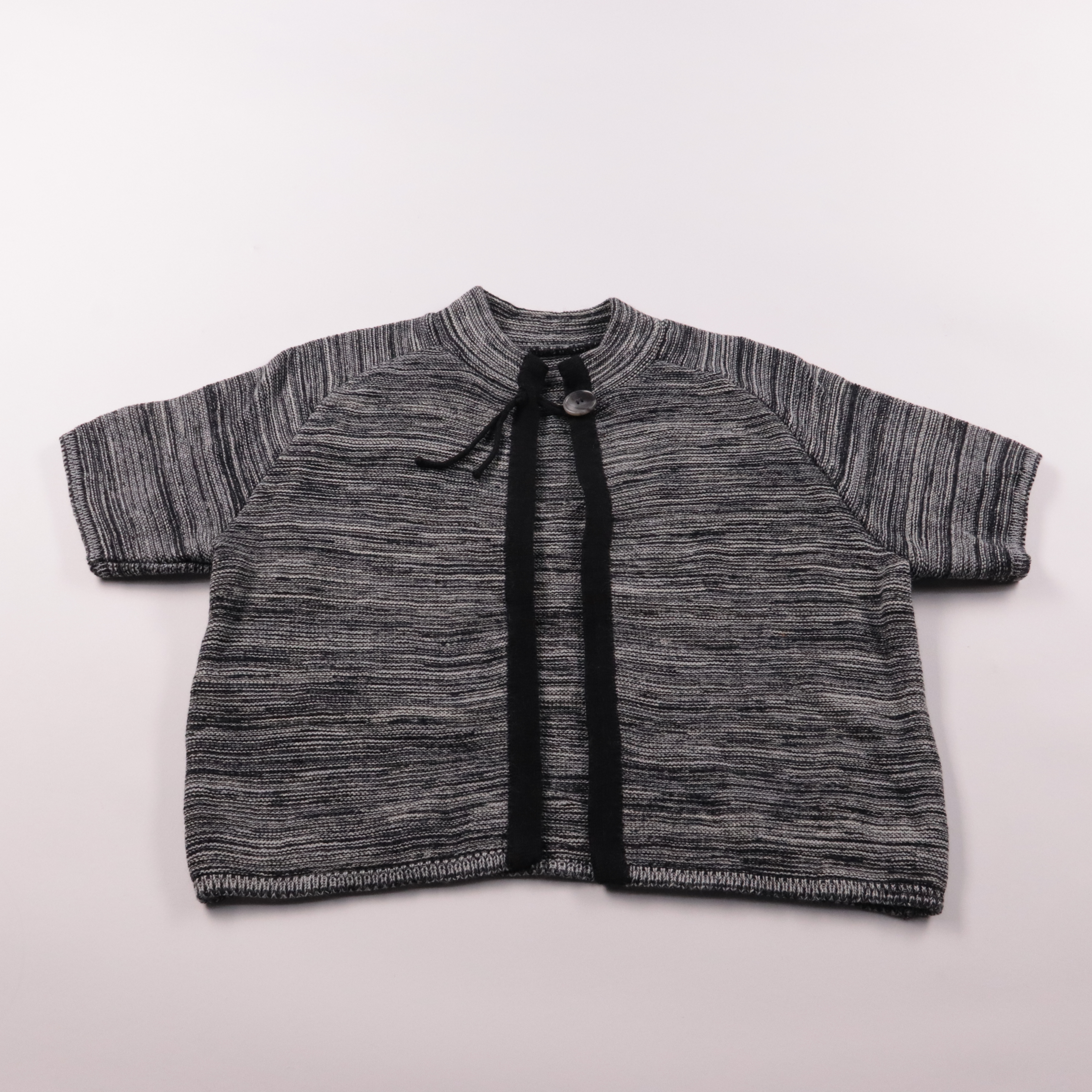 Вязаная кофта Feinstrick меланжевого серо-чёрного цвета с коротким рукавом и завязками у горловины. Подойдёт для школы или прогулок в прохладную погоду, удобно носить поверх футболки или блузки. Плотная вязка хорошо держит форму и не стесняет движений.