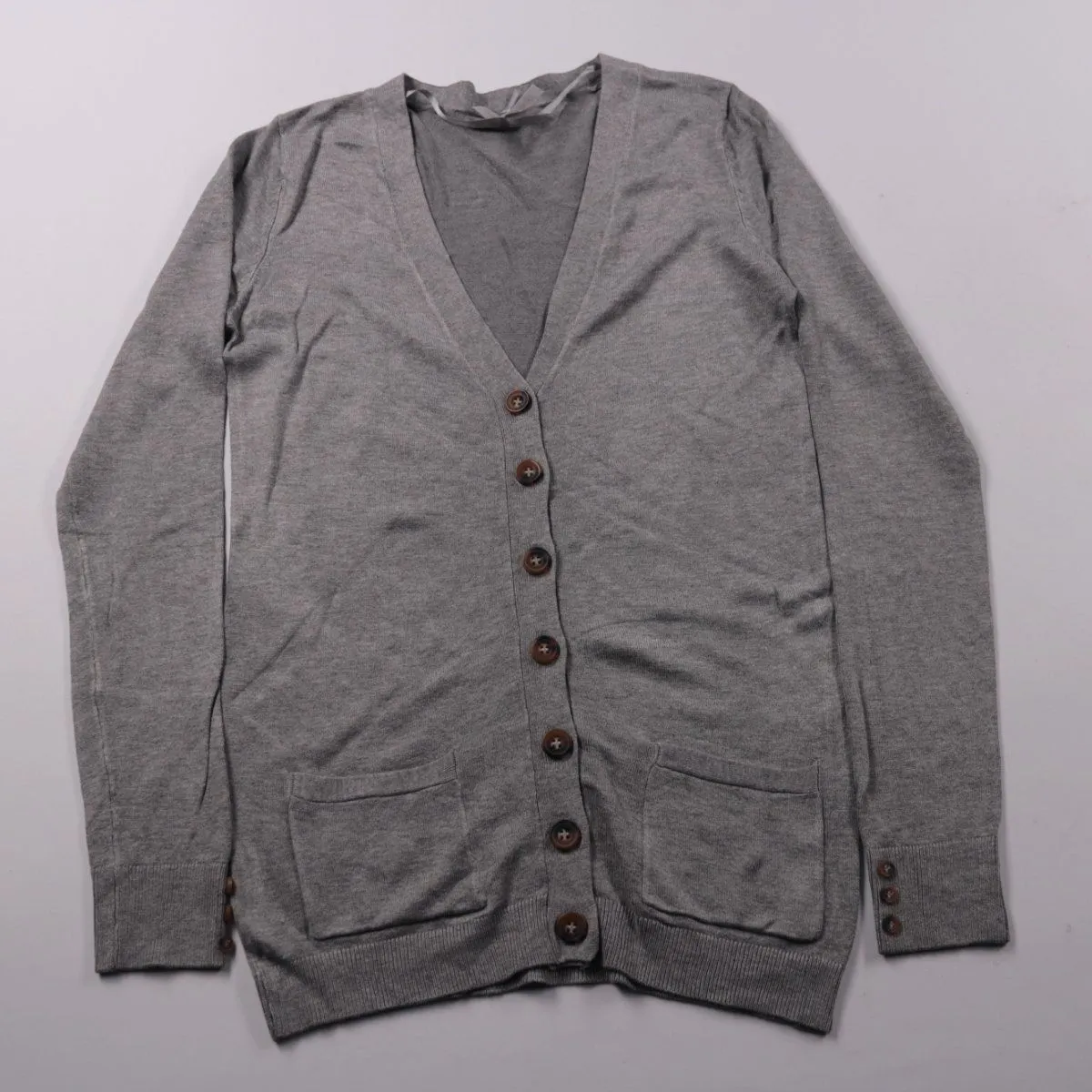 Серая кофта Atmosphere на пуговицах с V-образным вырезом и накладными карманами. Подойдёт для школы и повседневных образов в прохладную погоду, удобно носить поверх футболки или блузки. Тонкий трикотаж хорошо тянется и не стесняет движений.