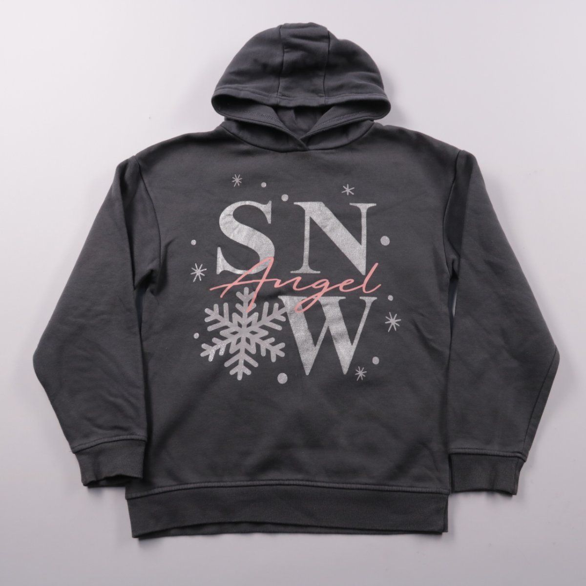 Худи Primark тёмно-серого цвета с зимним принтом Snow Angel и капюшоном. Подойдёт для школы и прогулок в прохладную погоду, удобно носить как верхний слой. Мягкая ткань с начёсом внутри сохраняет тепло.