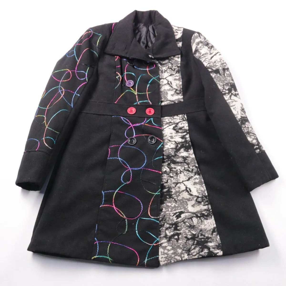 Демисезонное пальто для девочки с контрастными вставками и яркой декоративной прострочкой, без явного бренда на фото. Подойдёт для школы и прогулок в прохладную погоду, хорошо смотрится с базовыми вещами. Плотная ткань и подкладка делают модель практичной и удобной в носке.