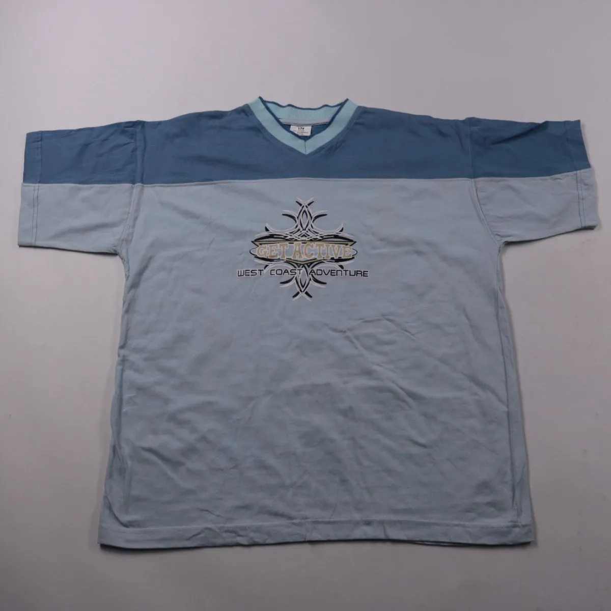 Детская футболка с коротким рукавом и V-образным вырезом, с принтом «Get Active / West Coast Adventure». Двухцветная (синий и голубой) подойдёт для лета, прогулок и занятий спортом. Хлопковая ткань хорошо дышит и легко стирается.