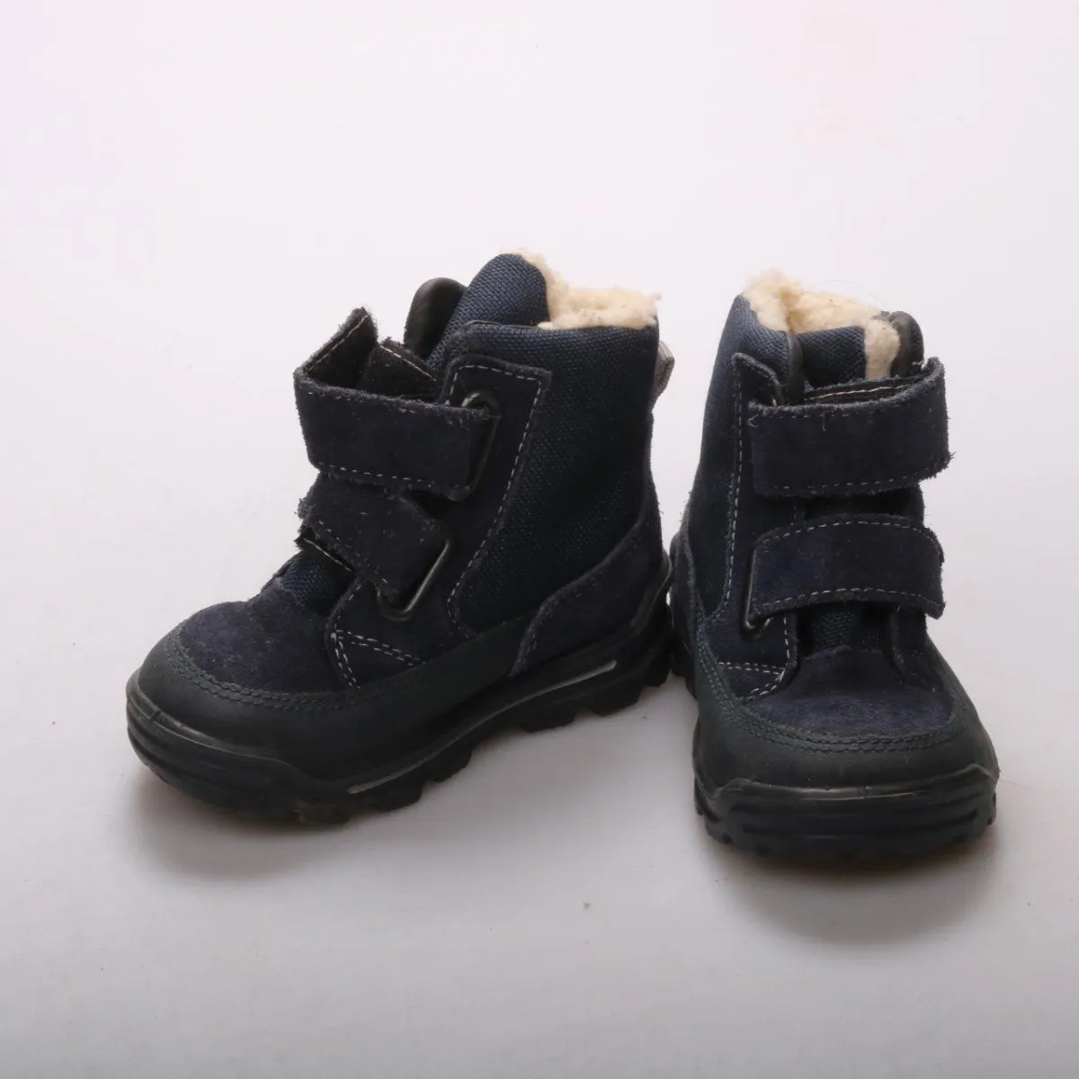 Детские зимние ботинки Pepino тёмно-синего цвета с утеплённой подкладкой и двумя застёжками-липучками. Подойдут для прогулок в холодную погоду, удобно быстро надевать и снимать. Рельефная подошва помогает лучше держаться на скользкой поверхности.