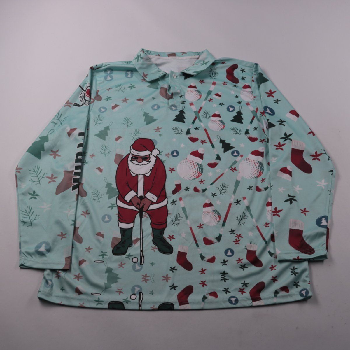 Рубашка-поло для мальчика с длинным рукавом и новогодним принтом (Дед Мороз, клюшки, носки) на голубом фоне. Подойдёт для повседневной носки и праздничных выходов зимой или в межсезонье. Ткань выглядит лёгкой и простой в уходе.