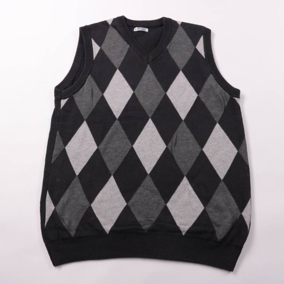 Вязаная жилетка Pepco с V-образным вырезом и ромбовидным узором в серо-чёрной гамме. Подойдёт для школы и повседневной носки поверх рубашки или водолазки. Удобно надевать слоями и можно быстро снять в помещении.