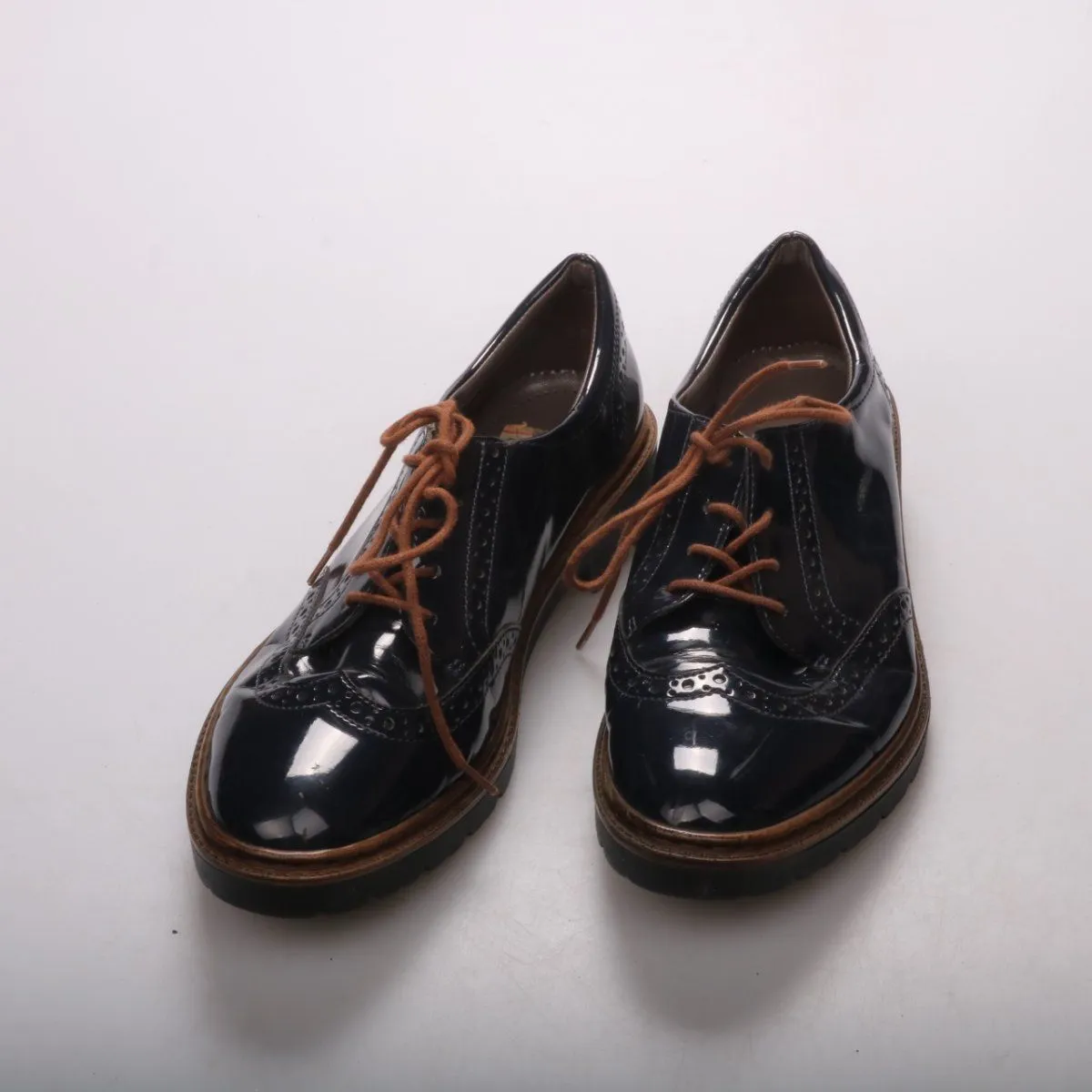 Мужские лакированные туфли-броги чёрного цвета на шнуровке с коричневыми шнурками и декоративной перфорацией. Подойдут для повседневной носки и образов в стиле smart casual в межсезонье. Рифлёная подошва даёт более уверенное сцепление на улице.