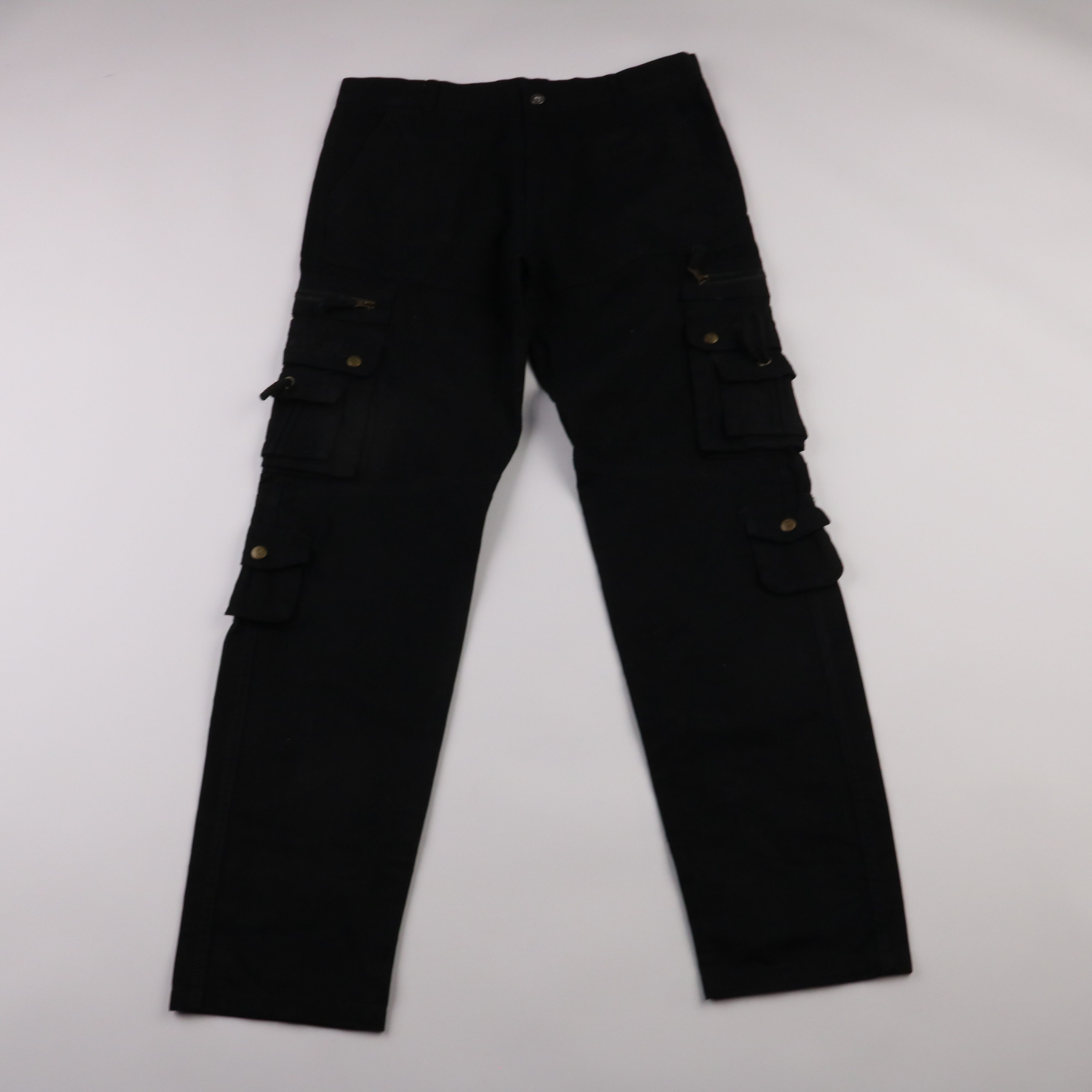 Чёрные брюки карго из хлопка с накладными карманами на кнопках по бокам. Подойдут для повседневных образов и активных прогулок, когда нужно носить с собой мелочи. Практичный плюс — много карманов для телефона, ключей и документов.