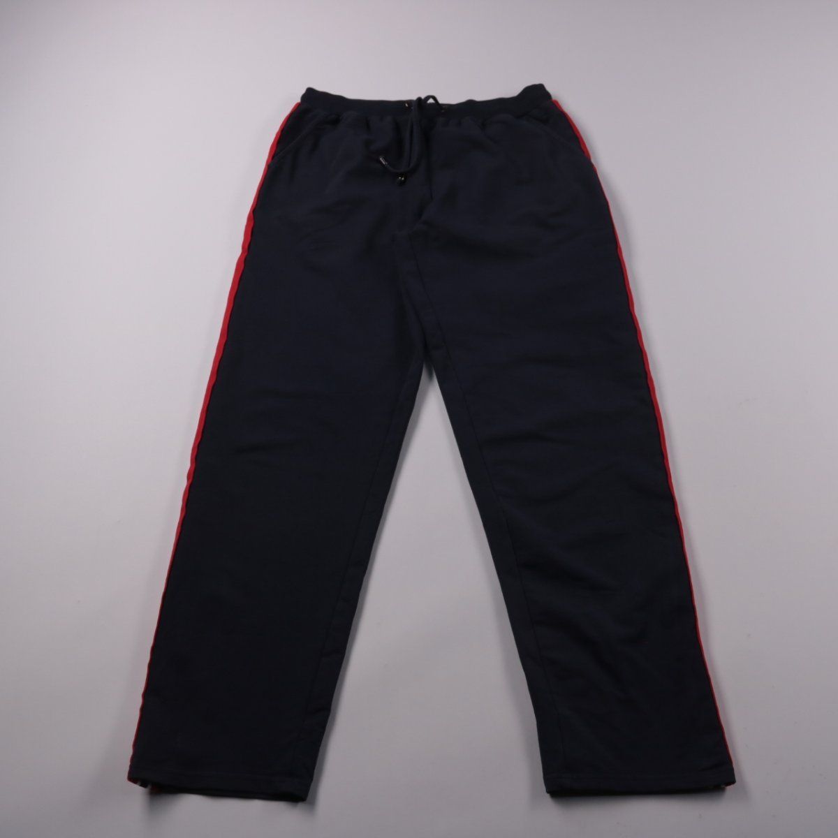 Тёплые мужские утеплённые брюки без указанного бренда, чёрного цвета с красными лампасами по бокам. Подойдут для прогулок и повседневной носки в холодную погоду. Плотный материал и утепление помогают сохранять тепло и защищают от ветра.