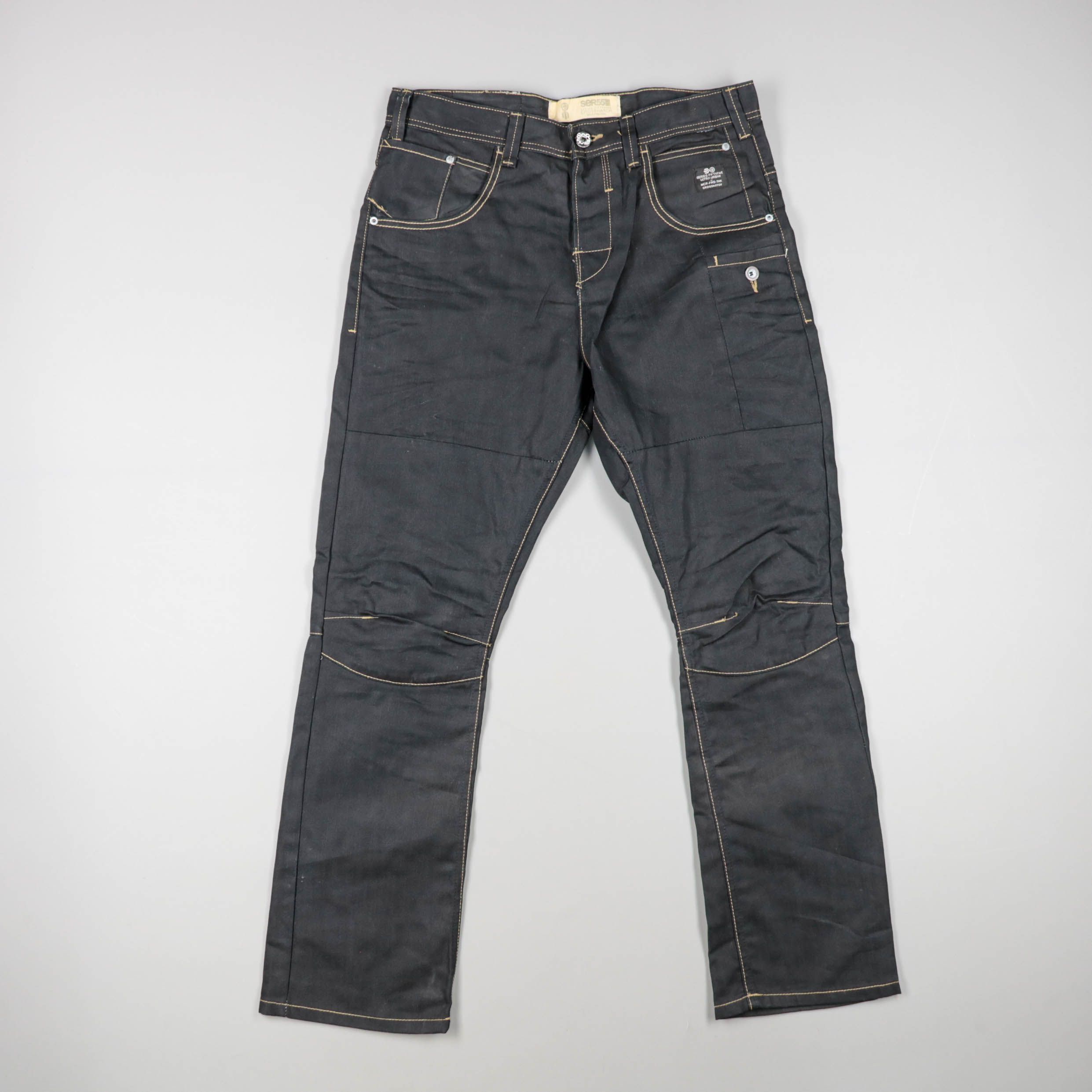 Мужские джинсы Ser55 тёмно-серого (почти чёрного) цвета с контрастной строчкой и усиленными вставками в зоне коленей. Подойдут для повседневной носки в городе и для активного дня, когда важны свобода движений и износостойкость. Плотный материал и допол...