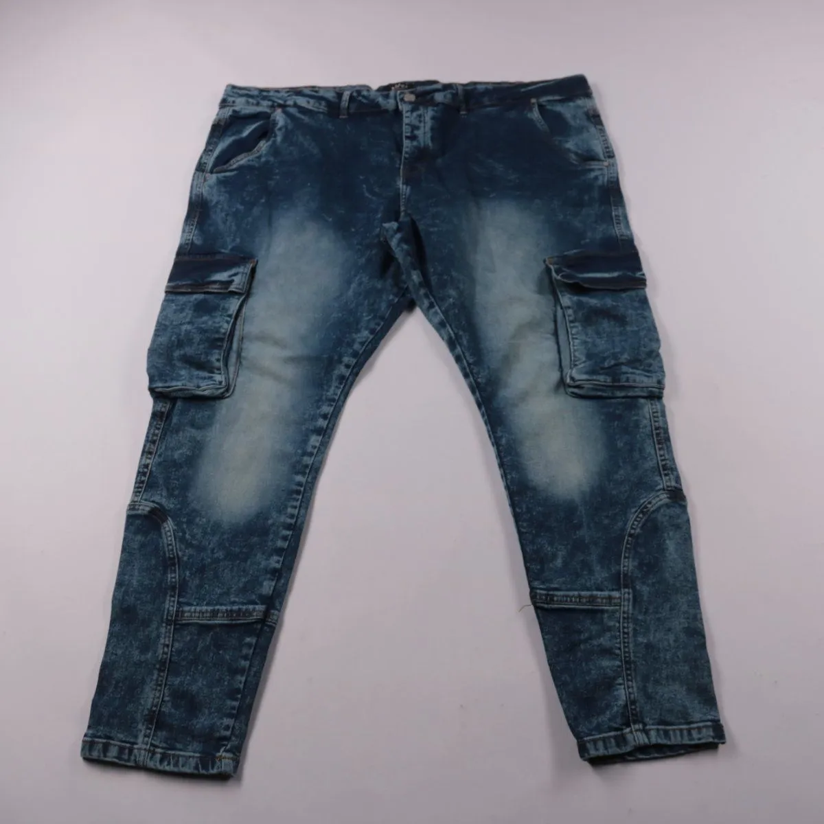 Мужские джинсы boohooMAN из денима с эффектом варки и накладными карго-карманами по бокам. Подойдут для повседневных и уличных образов в любое время года. Ткань с добавлением эластана даёт более комфортную посадку при движении.