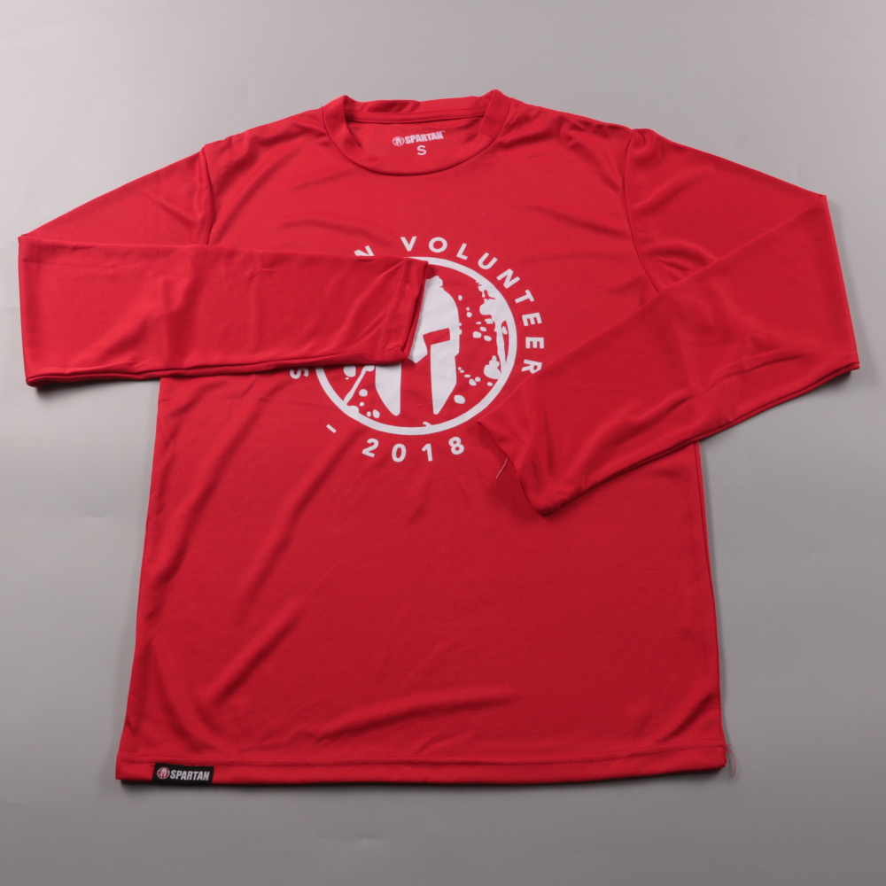 Лонгслив/футболка с длинным рукавом Spartan красного цвета с принтом Volunteer 2018 и логотипом на спине. Подойдёт для спорта, пробежек и повседневной носки в тёплую погоду или как базовый слой. Лёгкий полиэстер быстро сохнет и меньше мнётся в дороге.