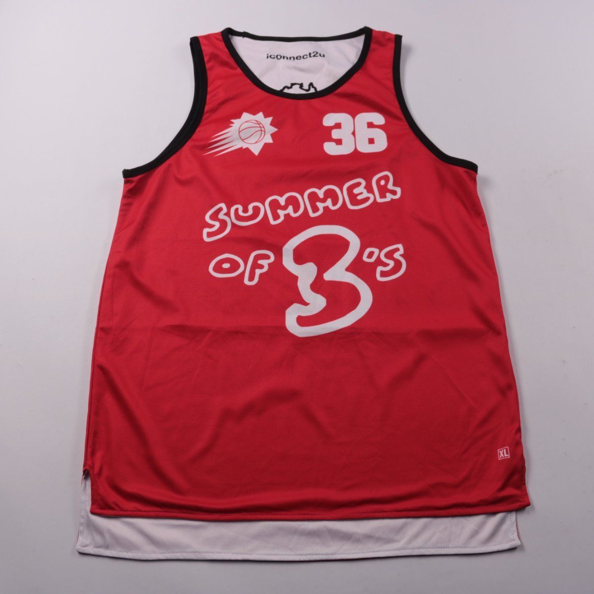 Спортивная майка iconnect2u, двусторонняя (красная/белая) с принтом и номером 36. Подойдёт для тренировок, игр и повседневных летних образов. Лёгкий материал быстро сохнет и не сковывает движения.