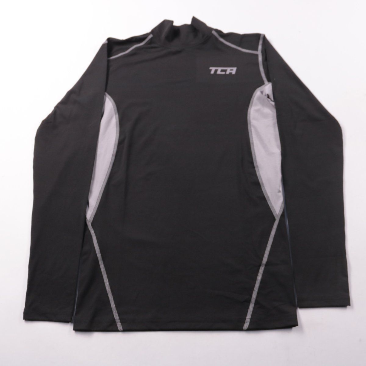 Мужская спортивная кофта TCA с длинным рукавом и высоким воротом, выполнена из эластичной синтетической ткани с серыми вставками. Подойдёт для тренировок, бега и как базовый слой в прохладную погоду. Материал тянется и быстро сохнет, удобно сидит под верхней одеждой.