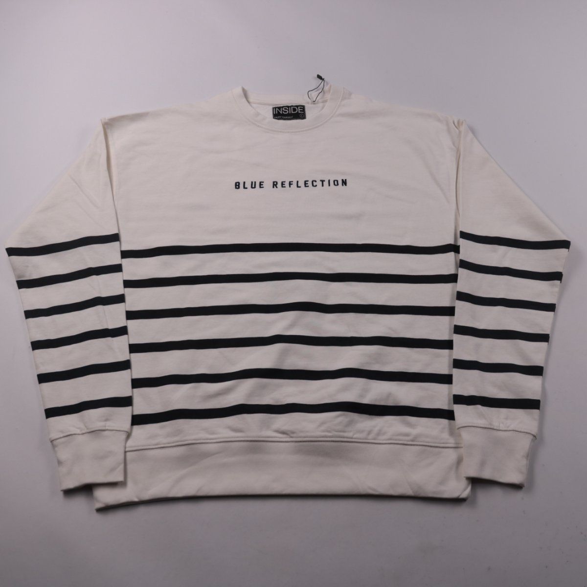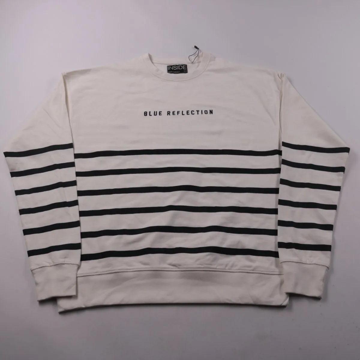 Мужской свитшот Inside в белом цвете с чёрными полосками и надписью BLUE REFLECTION на груди. Подойдёт для повседневной носки и в качестве слоя под куртку в прохладную погоду. Натуральный хлопок хорошо дышит и комфортен в течение дня.