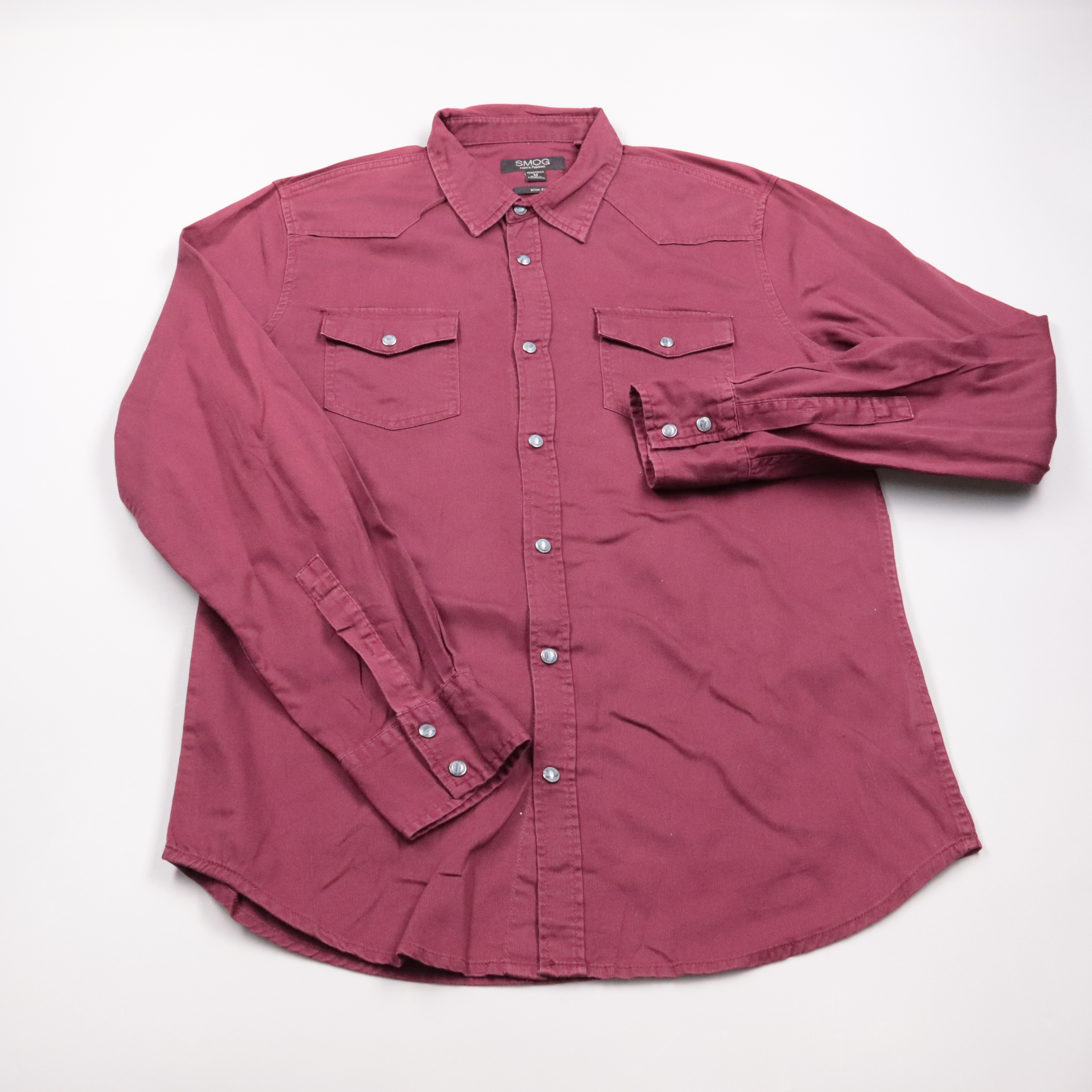 Мужская рубашка SMOG в бордовом цвете, модель slim fit, с длинным рукавом и двумя нагрудными карманами на кнопках. Подойдёт для повседневных образов и офиса в стиле casual, хорошо сочетается с джинсами и чиносами. Хлопковая ткань приятная к телу и хоро...