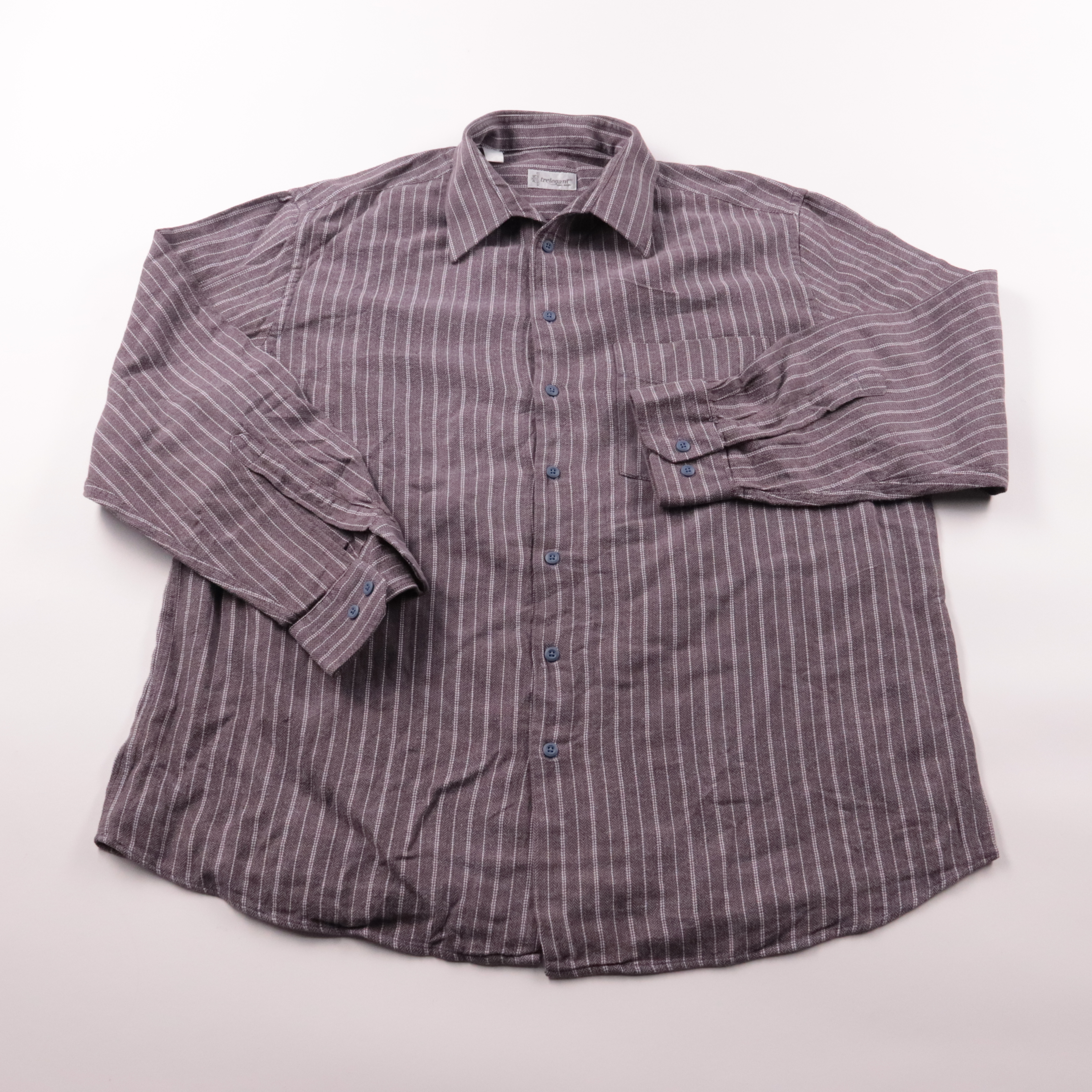 Мужская рубашка Trelegant в полоску, с длинным рукавом и накладным карманом на груди. Подойдёт для офиса и повседневных образов с джинсами или брюками. Практичный плюс — плотная ткань хорошо держит форму и менее заметны мелкие заломы.