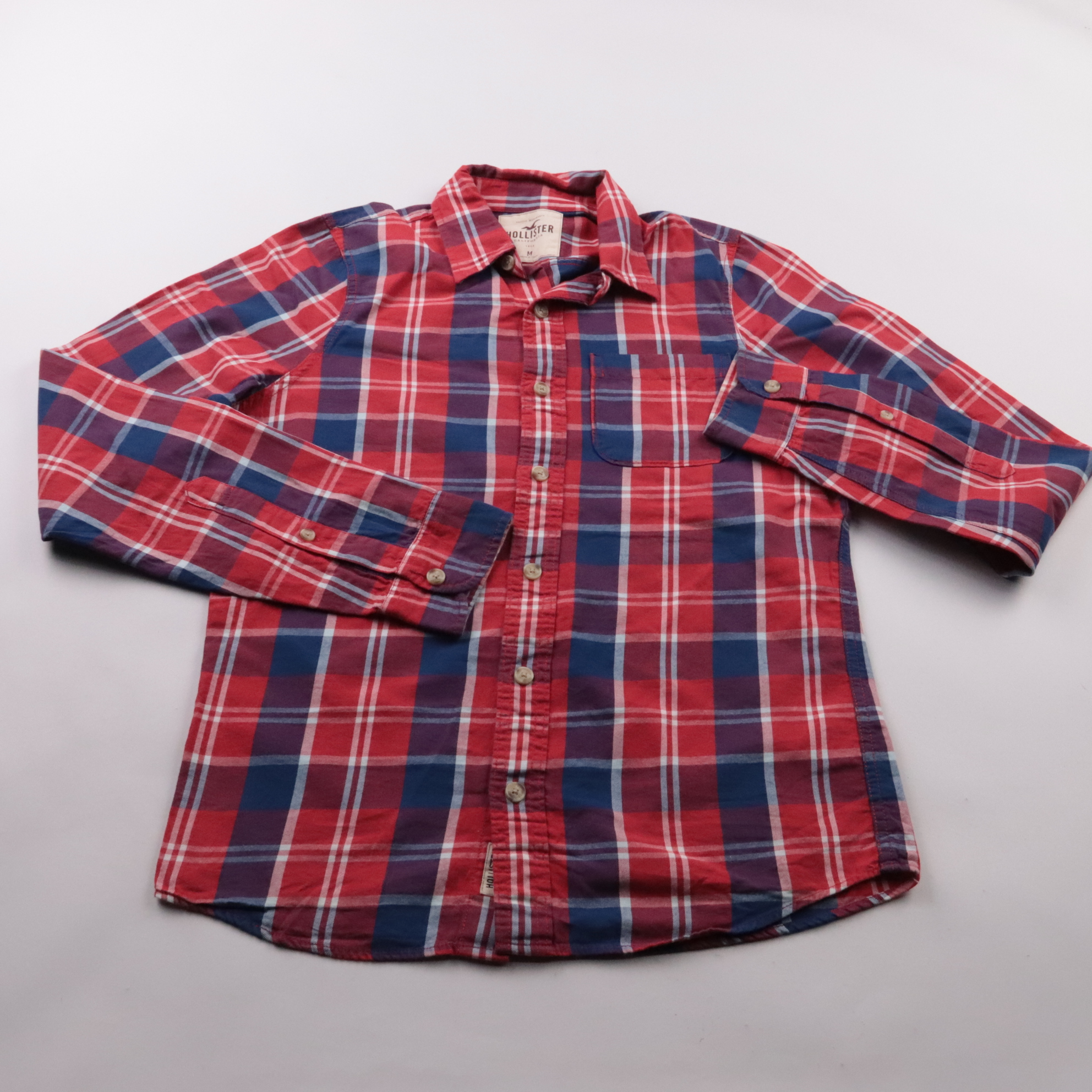 Мужская рубашка Hollister в красно-сине-белую клетку, застёгивается на пуговицы, с нагрудным карманом. Подойдёт для повседневной носки в прохладную погоду и как верхний слой поверх футболки. Натуральный хлопок хорошо дышит и комфортен в течение дня.