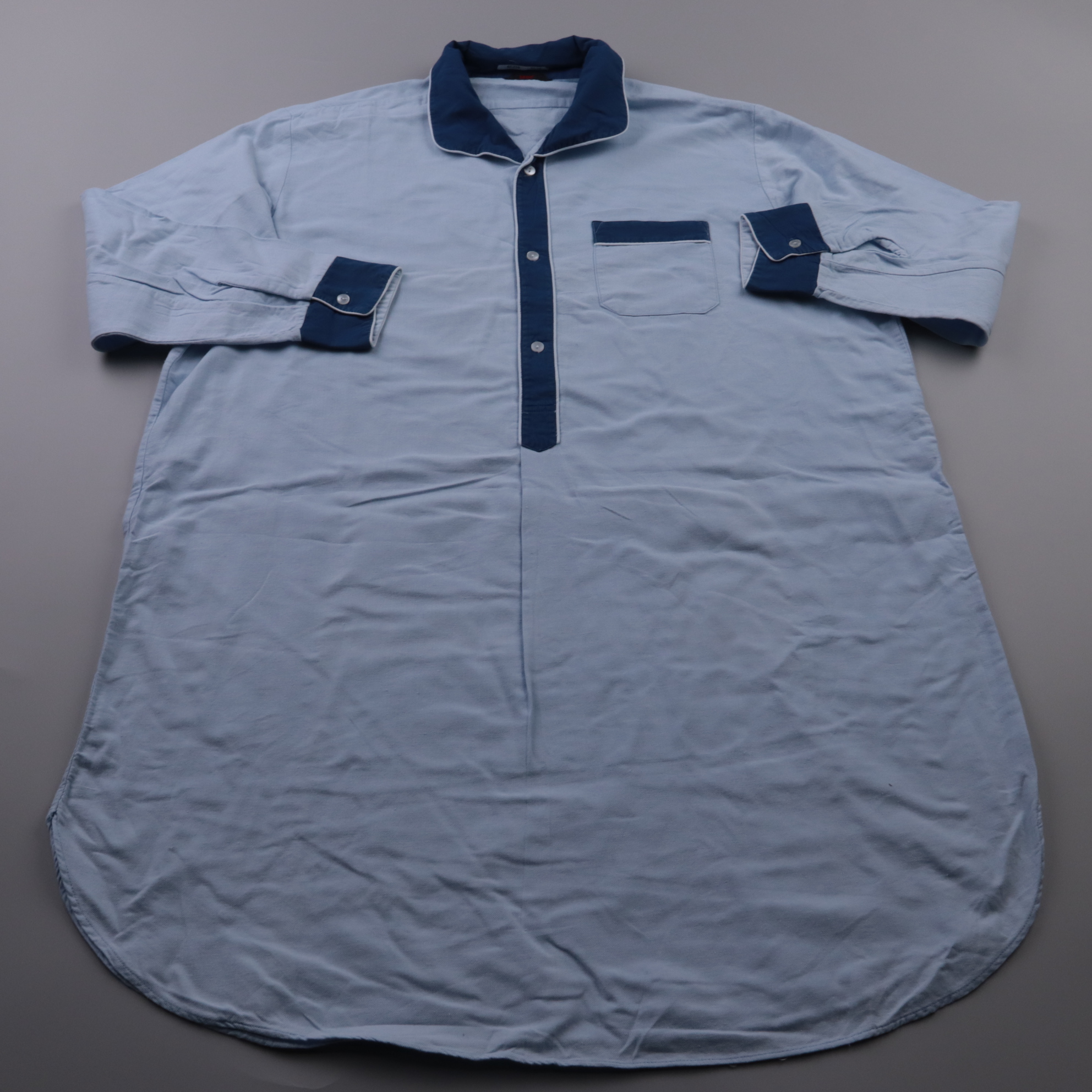 Мужская рубашка в светло-голубом цвете с контрастной тёмно-синей планкой и воротником, есть нагрудный карман. Подойдёт для повседневной носки и работы, можно сочетать с джинсами или чиносами. Практичный плюс — длинный крой и застёжка на пуговицы, удобн...