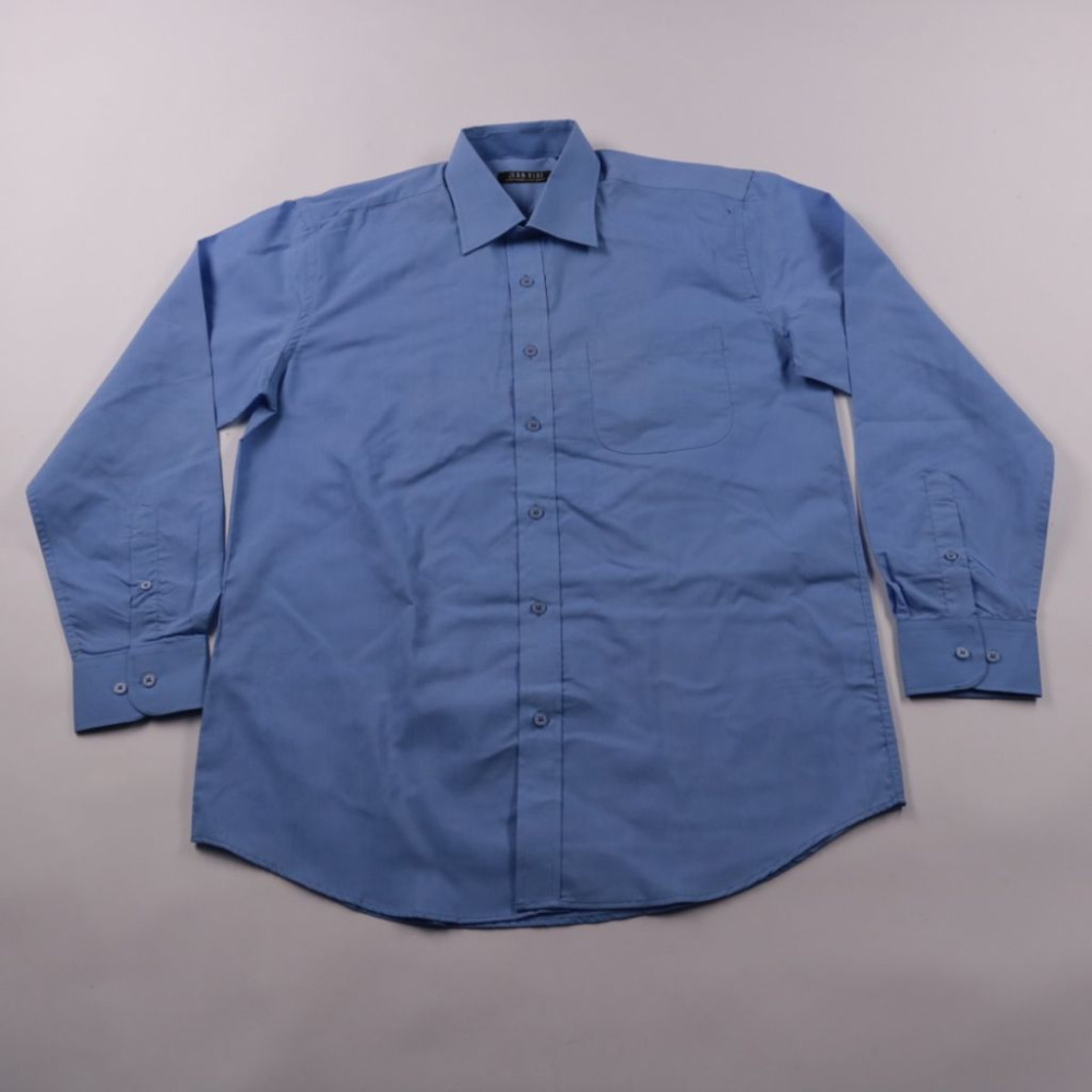 Мужская рубашка Jean Blue в голубом цвете с длинным рукавом и нагрудным карманом. Подойдёт для офиса и повседневных образов, хорошо сочетается с брюками и джинсами. Смесовая ткань меньше мнётся и проще в уходе.