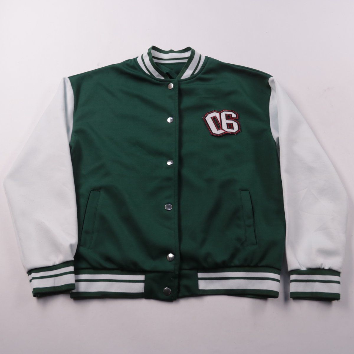 Двухцветный бомбер без бренда: тёмно-зелёный корпус и белые рукава, застёжка на кнопках, нашивка «06» на груди. Подойдёт для повседневных образов в прохладную погоду и как лёгкая верхняя одежда на весну/осень. Практичный плюс — эластичные манжеты и пояс держат посадку, есть боковые карманы.