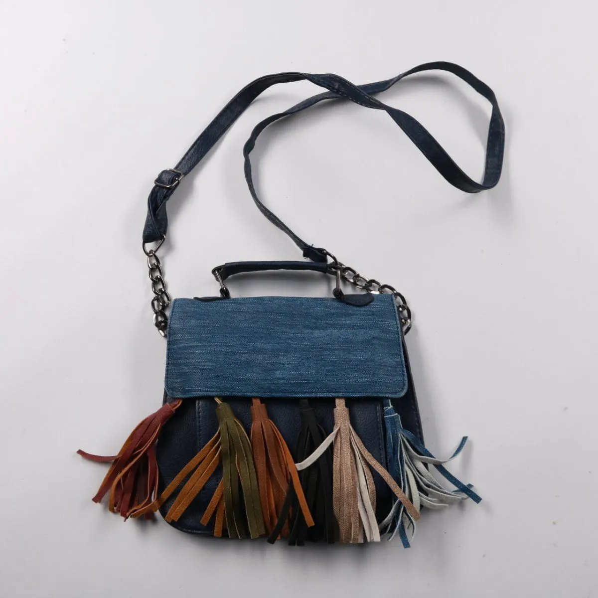 Женская сумка кросс-боди в джинсово-синем цвете с декором из разноцветной бахромы и клапаном на магнитной кнопке. Подойдёт для повседневных выходов и летних прогулок, когда нужно взять с собой самое необходимое. Длинный регулируемый ремень позволяет носить на плече или через плечо, освобождая руки.