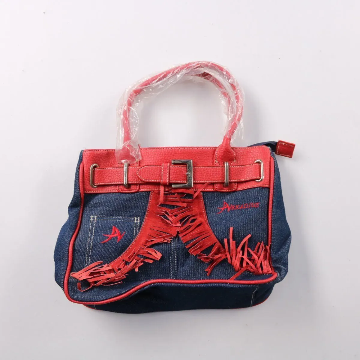 Джинсовая сумка Arkadius с красной отделкой и декоративной бахромой, удобна для повседневных прогулок и городских дел. Подойдёт тем, кто любит яркие акценты в образе и компактный формат. Практичное преимущество — плотный деним и два внешних кармана сзади для мелочей.