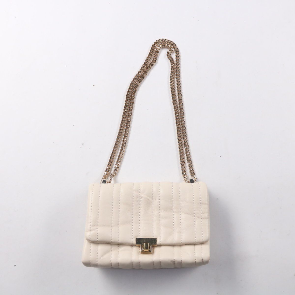 Сумка Zara светлого бежевого цвета со стёжкой и клапаном на замке, на длинной цепочке. Подойдёт для прогулок и выхода, когда нужно взять с собой самое необходимое. Внутри несколько отделений, удобно разложить телефон и мелочи.