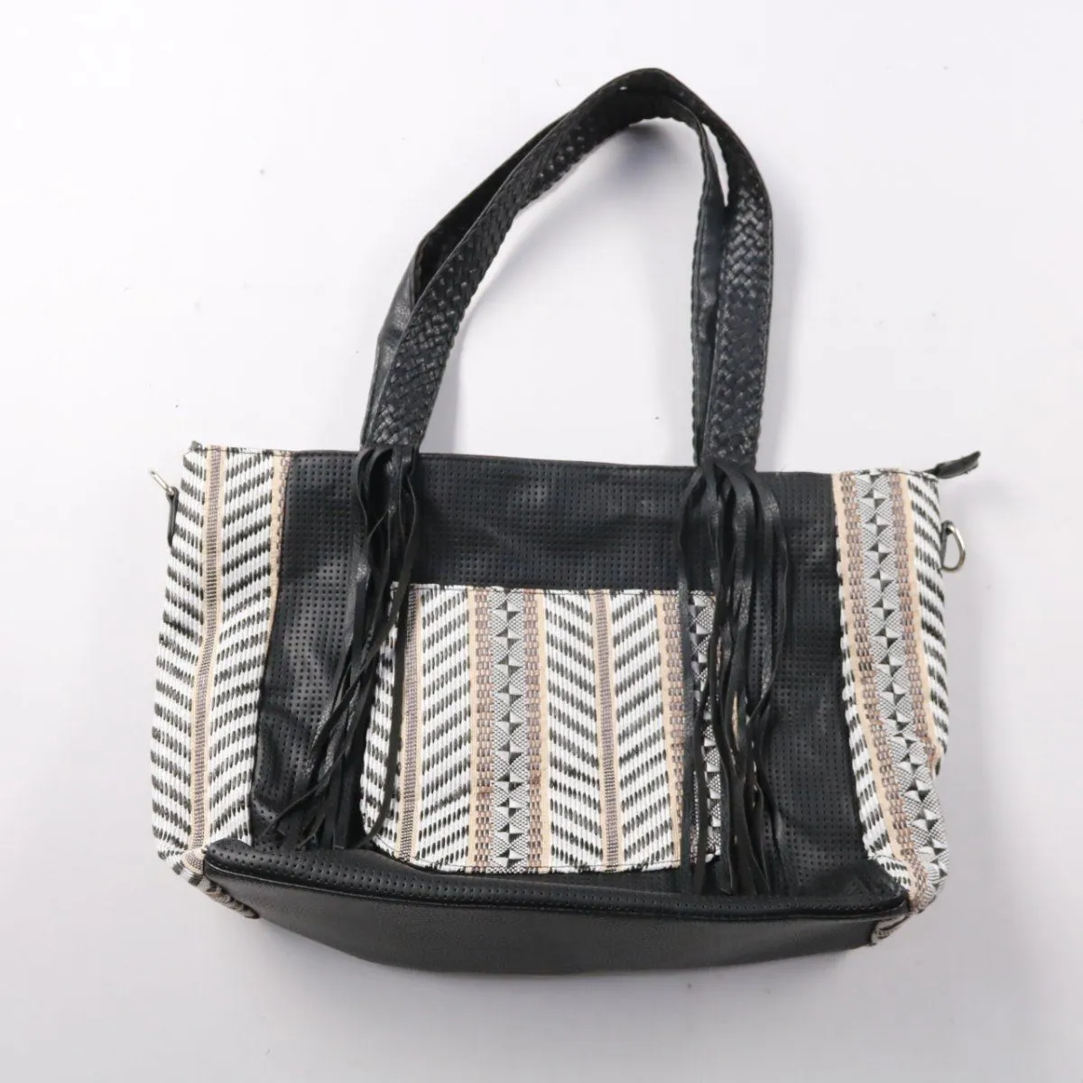 Сумка с ручками из комбинированных материалов с чёрной основой и вставками с геометрическим узором, в комплекте есть длинный ремень на карабинах. Подойдёт для повседневных дел и поездок по городу, закрывается на молнию. Внутри есть подкладка и карман на молнии, удобно разложить мелочи отдельно.