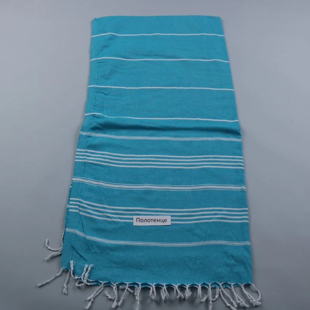 Хлопковое полотенце в бирюзовом цвете с белыми полосками и кисточками по краю. Подойдёт для ванной, пляжа или бани, ткань хорошо впитывает влагу и быстро сохнет.