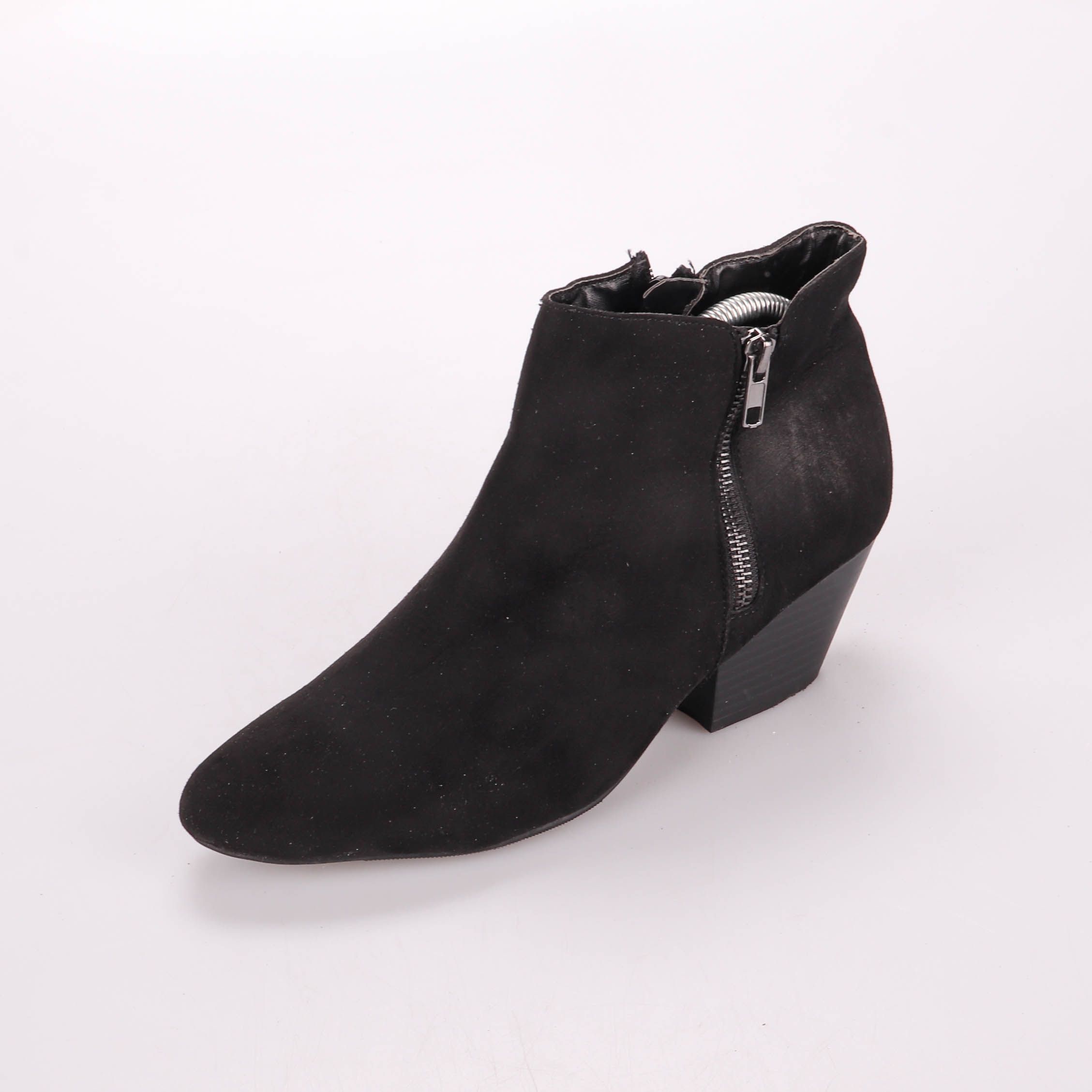 Женские ботильоны из чёрного материала под замшу, с острым носком и боковой молнией. Подойдут на каждый день и для офисных образов в демисезон. Устойчивый каблук делает их удобными для длительной носки.