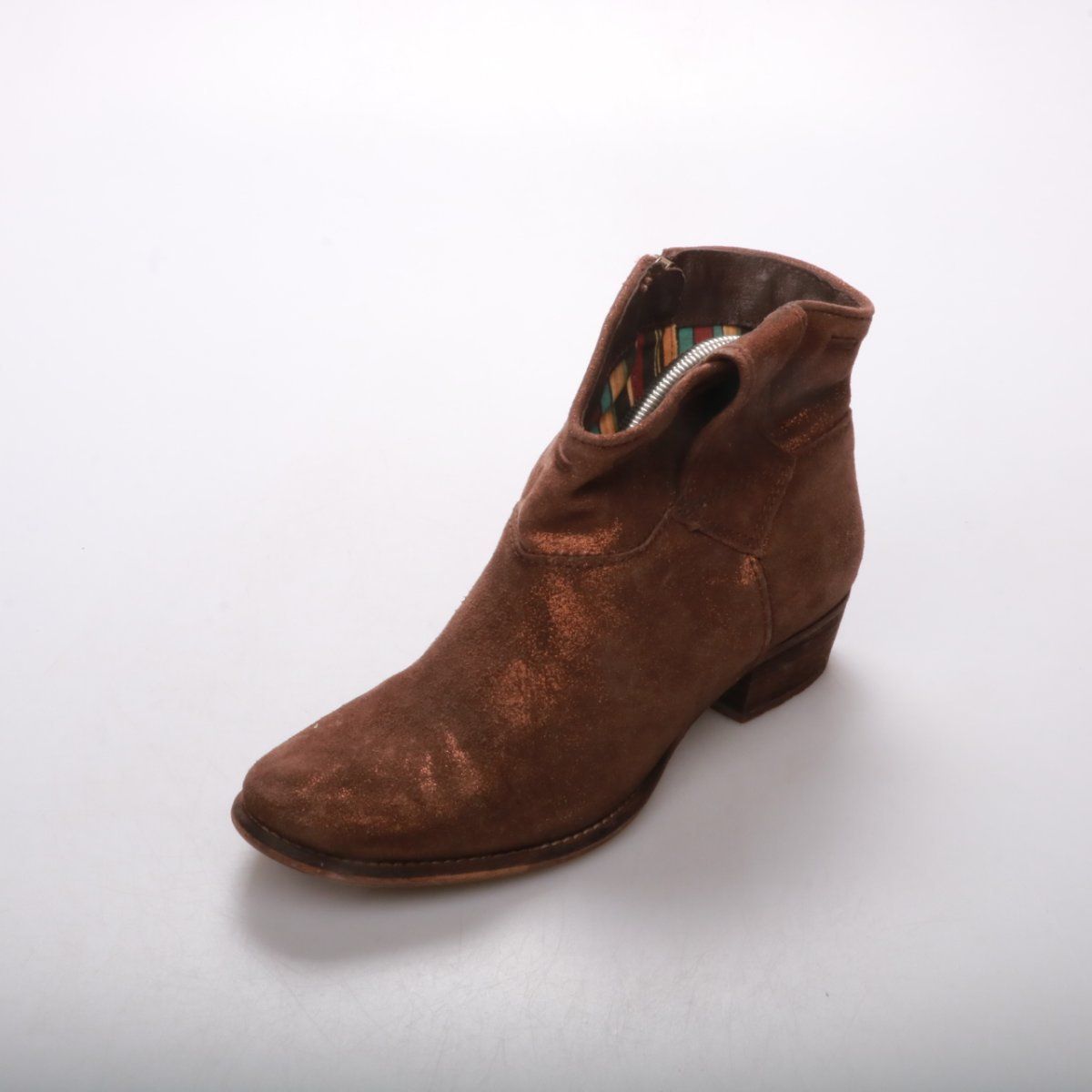 Замшевые ботильоны в коричневом цвете на низком устойчивом каблуке, застёжка на молнию сбоку. Подойдут для повседневных образов осенью и весной с джинсами или платьями. Практичный плюс — удобная колодка и устойчивый каблук для ходьбы.