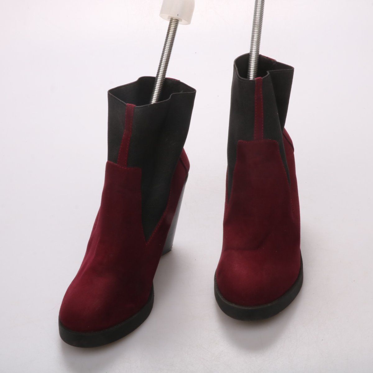 Женские ботильоны Primark из замшевого материала бордового цвета с чёрными эластичными вставками по бокам и устойчивым каблуком. Подойдут для повседневных образов в прохладную погоду, с джинсами или платьями. Эластичные вставки помогают быстрее надевать обувь без молнии и шнуровки.