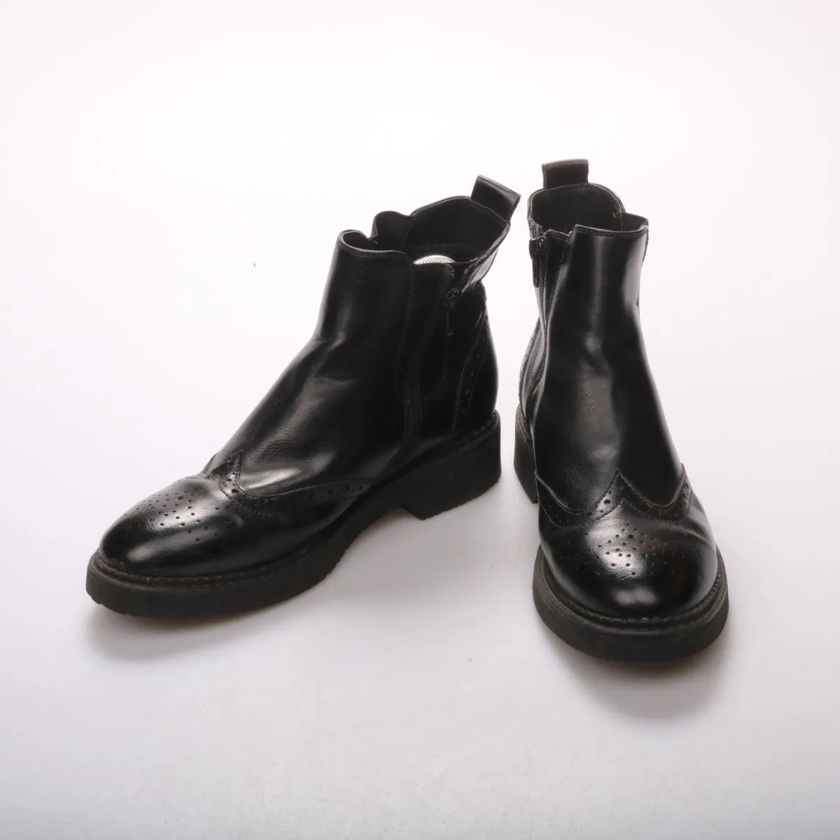 Черные кожаные ботильоны в стиле челси с декоративной перфорацией на носке и эластичными вставками по бокам. Подойдут для повседневной носки в демисезон, хорошо сочетаются с джинсами и платьями. Практичное преимущество — удобная боковая молния и устойчивая подошва.