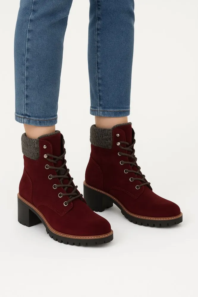 Женские зимние ботинки из материала под замшу в бордовом цвете, с шнуровкой и боковой молнией. Внутри тёплая меховая подкладка, поэтому подойдут для холодной погоды и повседневных прогулок. Рифлёная подошва на устойчивом каблуке даёт хорошее сцепление ...