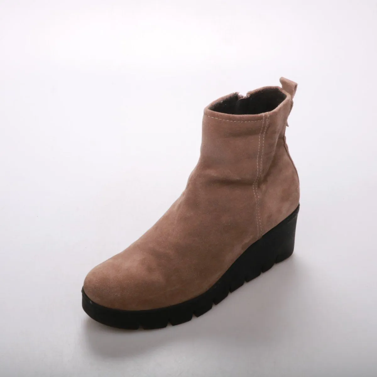 Женские ботинки 5th Avenue из натуральной замши в бежево-коричневом оттенке на массивной рифлёной подошве. Подойдут для повседневной носки в демисезон с джинсами и брюками. Устойчивая платформа и боковая молния делают посадку удобной и быстрой.