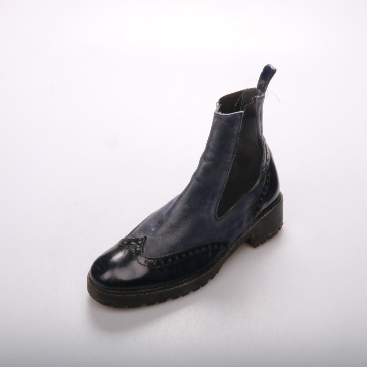 Женские ботинки-«челси» без бренда, тёмно-синие с чёрными вставками и декоративной перфорацией по канту. Подойдут для повседневных образов в межсезонье, с джинсами или брюками. Рифлёная подошва даёт более уверенное сцепление на мокром асфальте.