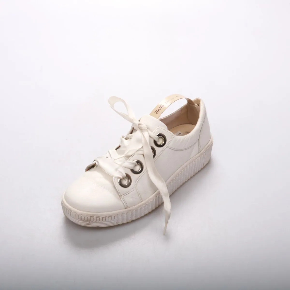 Белые кеды Gabor из кожи с широкими лентами-шнурками и крупными люверсами. Подойдут для повседневных образов в городе в тёплый сезон и межсезонье. Рифлёная подошва даёт более уверенное сцепление на разных покрытиях.