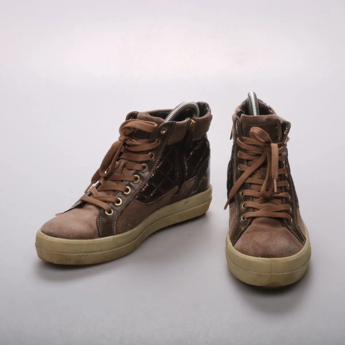 Женские высокие кеды Coach из замши и кожи коричневого цвета с шнуровкой и боковой молнией. Подойдут для повседневной носки в городе в демисезон. Практичное преимущество — молния позволяет быстро обуваться без постоянной перешнуровки.