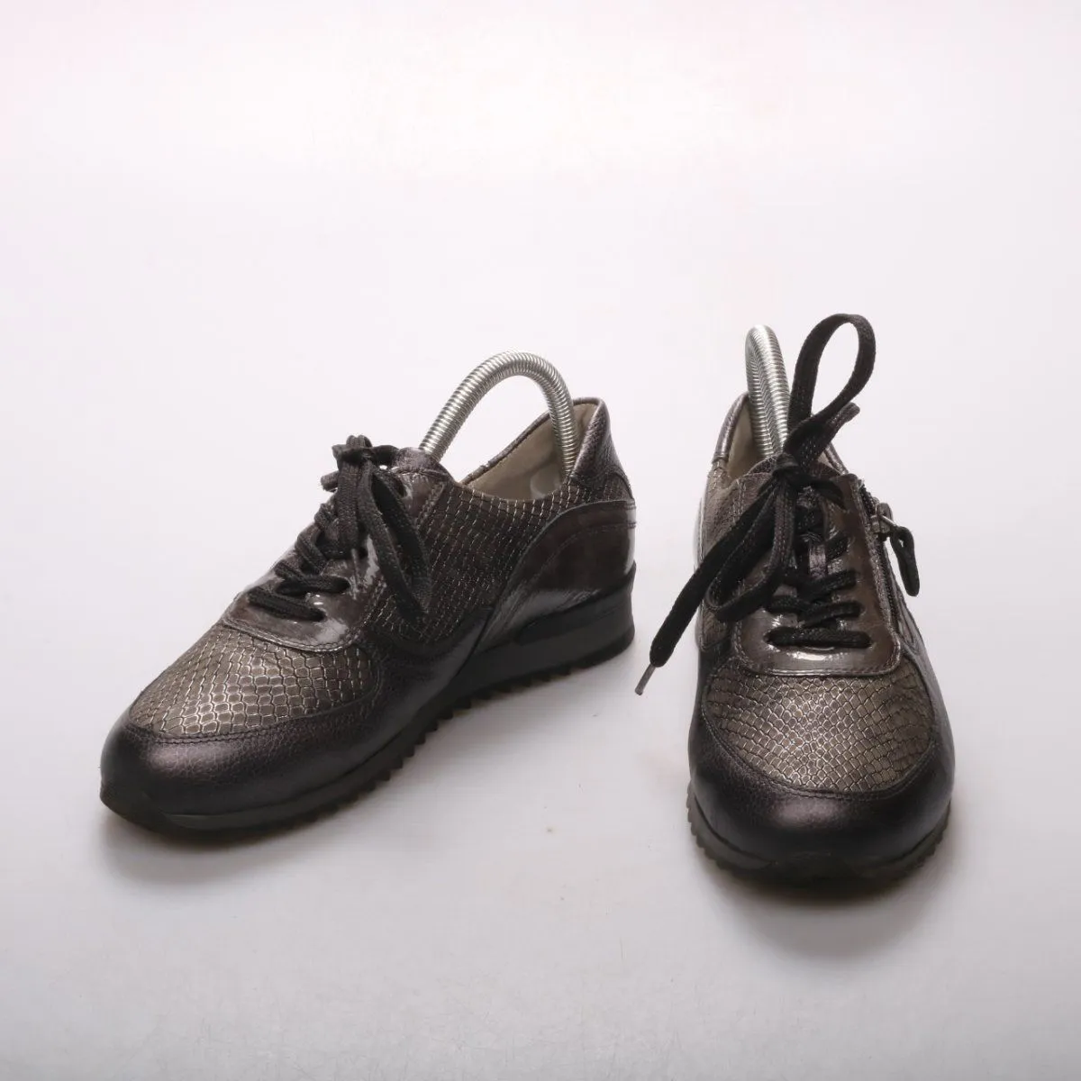 Женские кроссовки из фактурной кожи с тиснением под рептилию, на шнуровке и с боковой молнией. Подойдут для повседневной носки в городе и поездок благодаря устойчивой подошве. Практичное преимущество — удобная посадка и быстрое обувание за счёт молнии.
