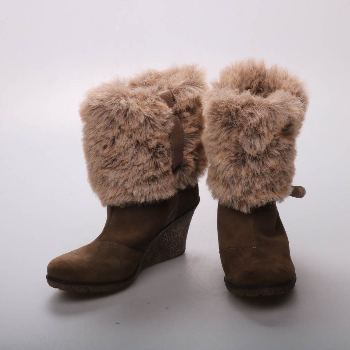 Женские полусапоги SDM из замши с широким меховым голенищем и устойчивой танкеткой. Подойдут для зимних прогулок и повседневной носки в городе. Практичный плюс — высокая танкетка и рельефная подошва дают более уверенное сцепление и не промокают так быстро.