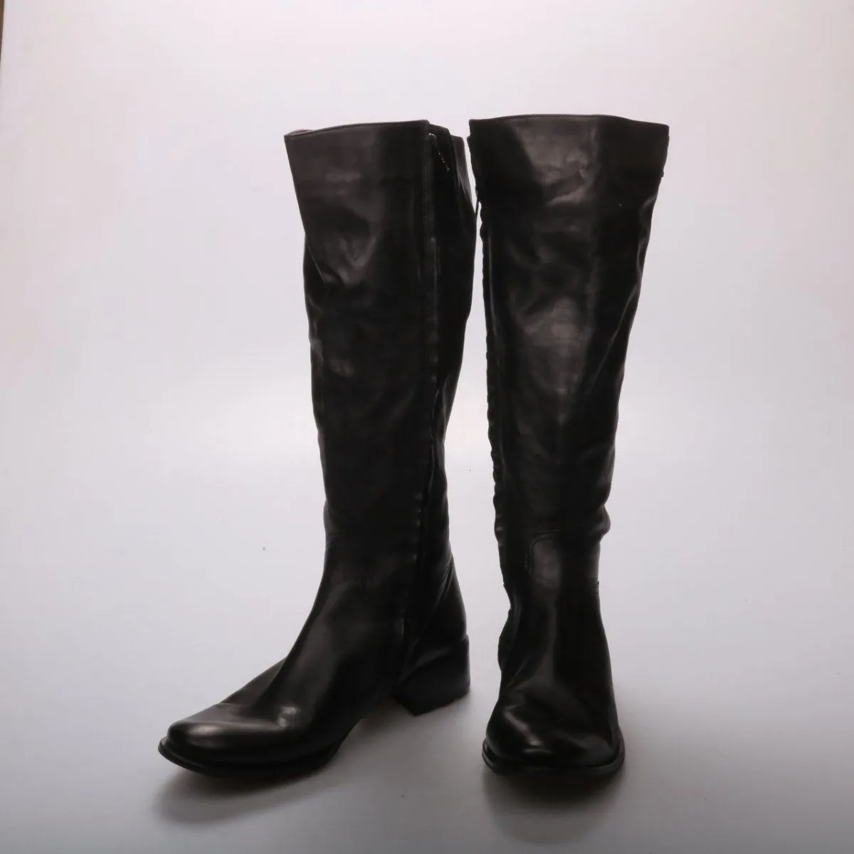 Высокие кожаные сапоги Hogl чёрного цвета на устойчивом невысоком каблуке, с застёжкой-молнией сбоку. Подойдут для повседневной носки в прохладную погоду и к классическим или casual-образам. Рельефная подошва даёт хорошее сцепление на мокром асфальте.