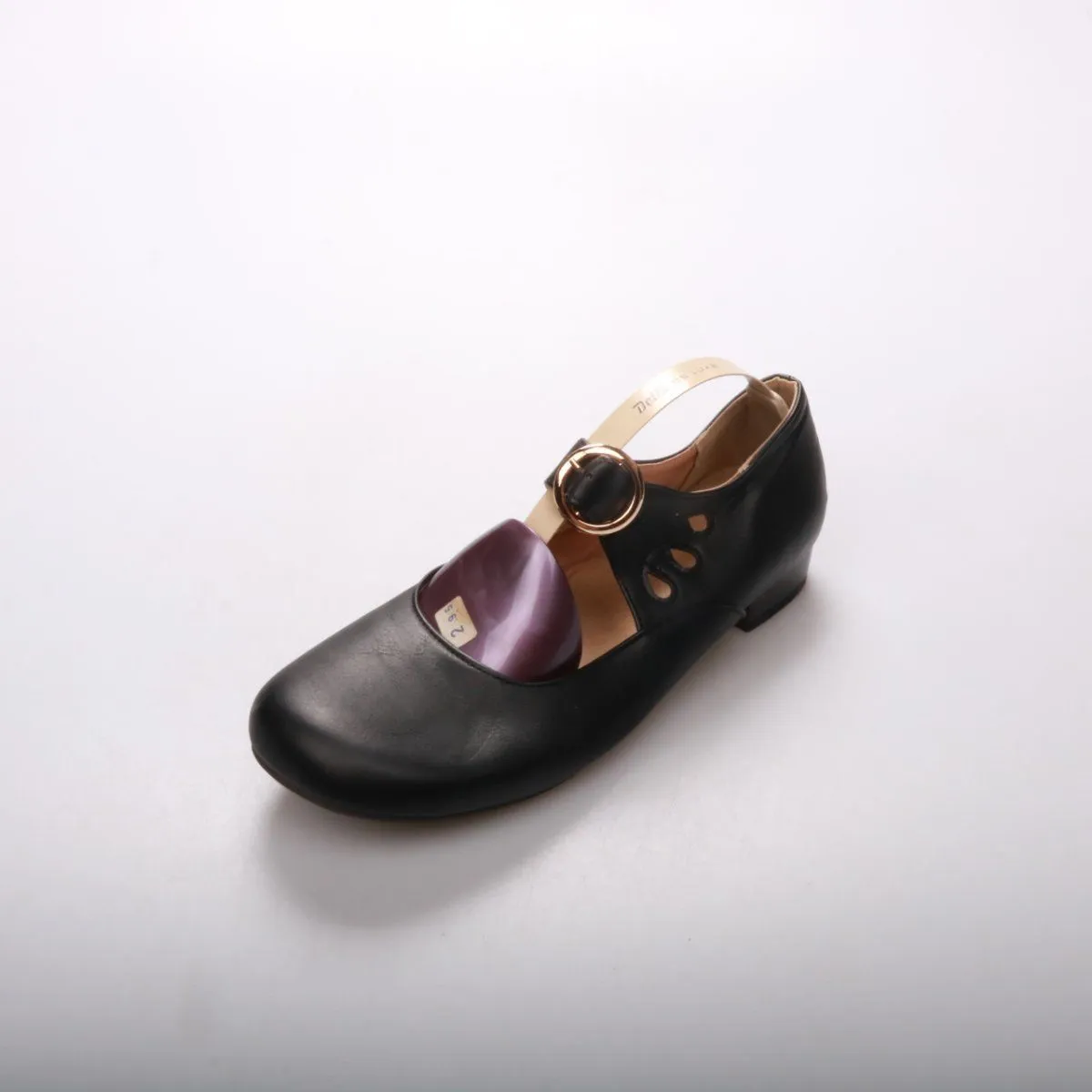 Туфли с ремешком (Mary Jane) в чёрном цвете, на низком устойчивом каблуке и с декоративной пряжкой. Подойдут для повседневной носки и в офис, легко сочетаются с платьями, юбками и брюками. Закрытый нос и фиксирующий ремешок хорошо держат ногу и делают посадку комфортнее.