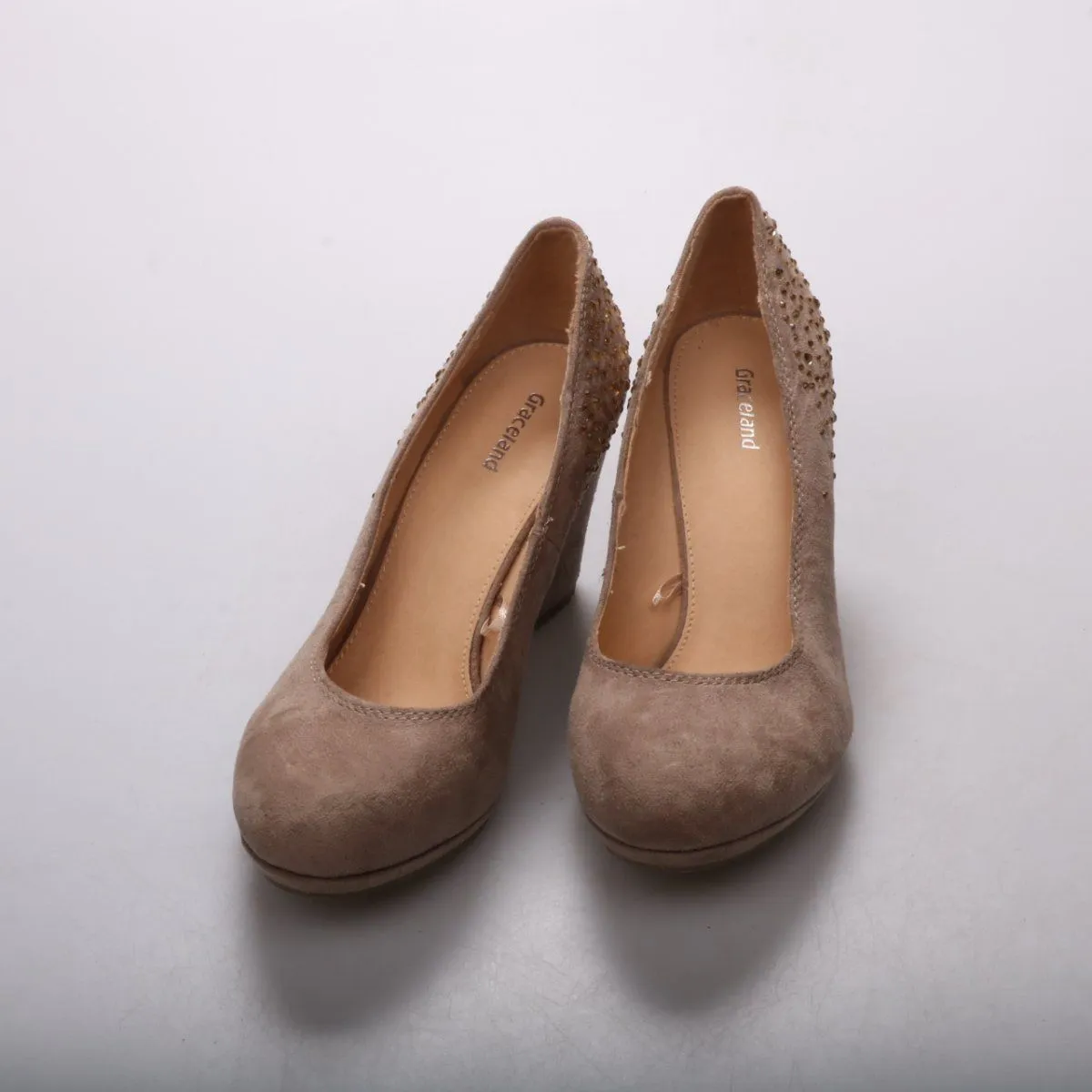 Женские туфли Graceland на танкетке из замшевого материала, с декоративными заклёпками на пятке. Подойдут для офиса, учебы и повседневных образов в демисезон и в помещении. Танкетка устойчивее классического каблука и удобна при длительной носке.